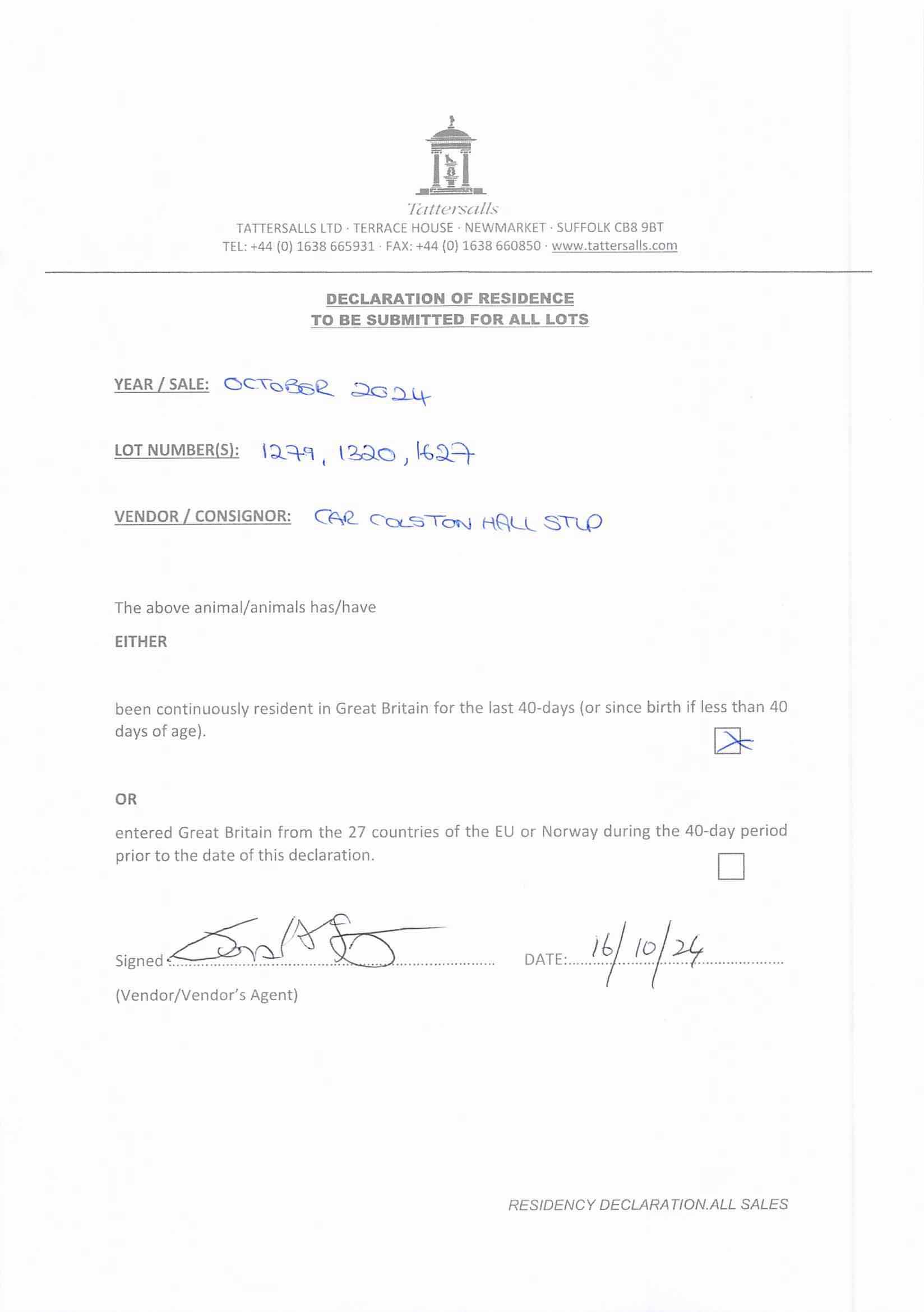 Consignor: Car Colston Hall Stud
