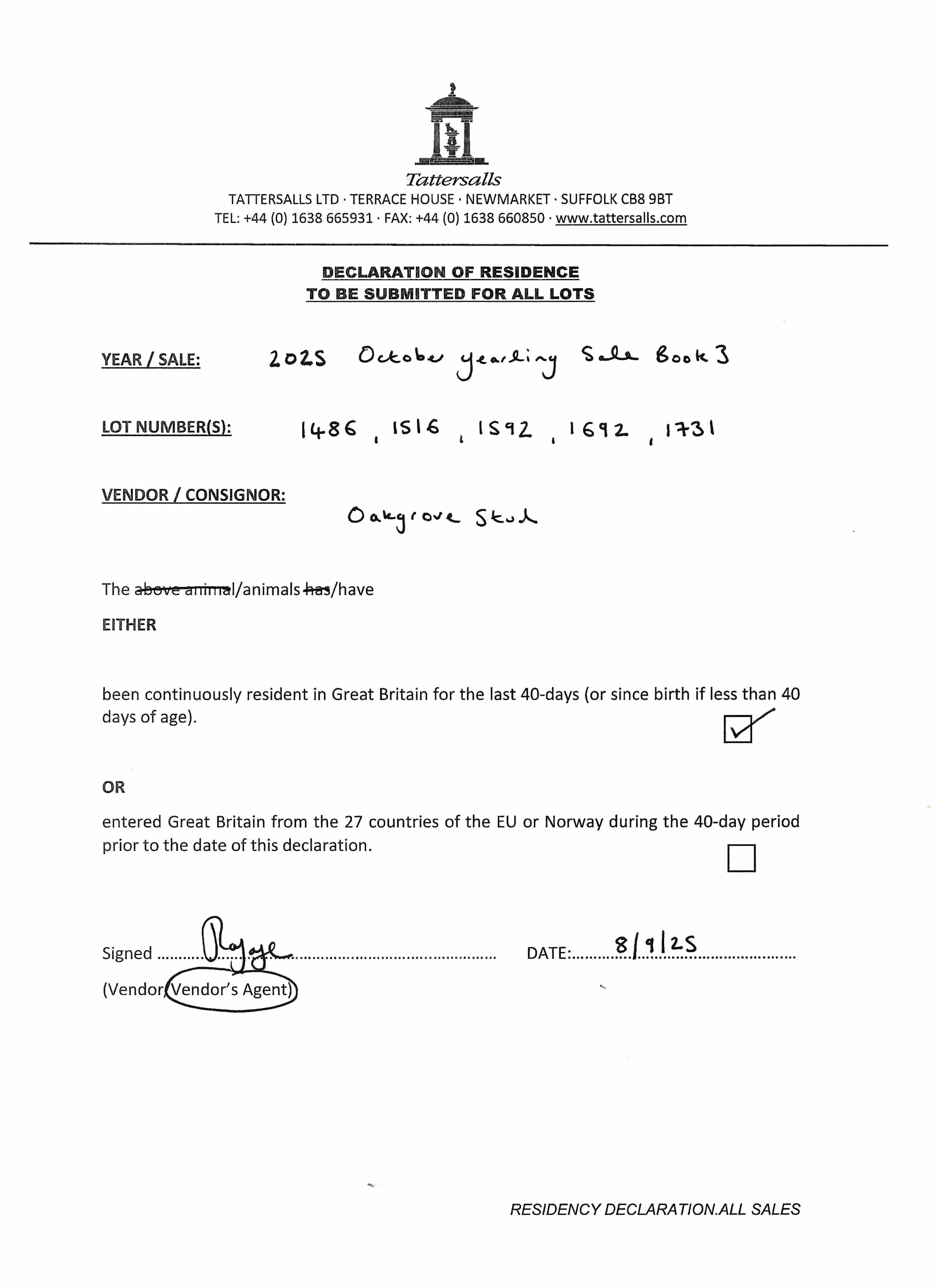 Consignor: Oakgrove Stud