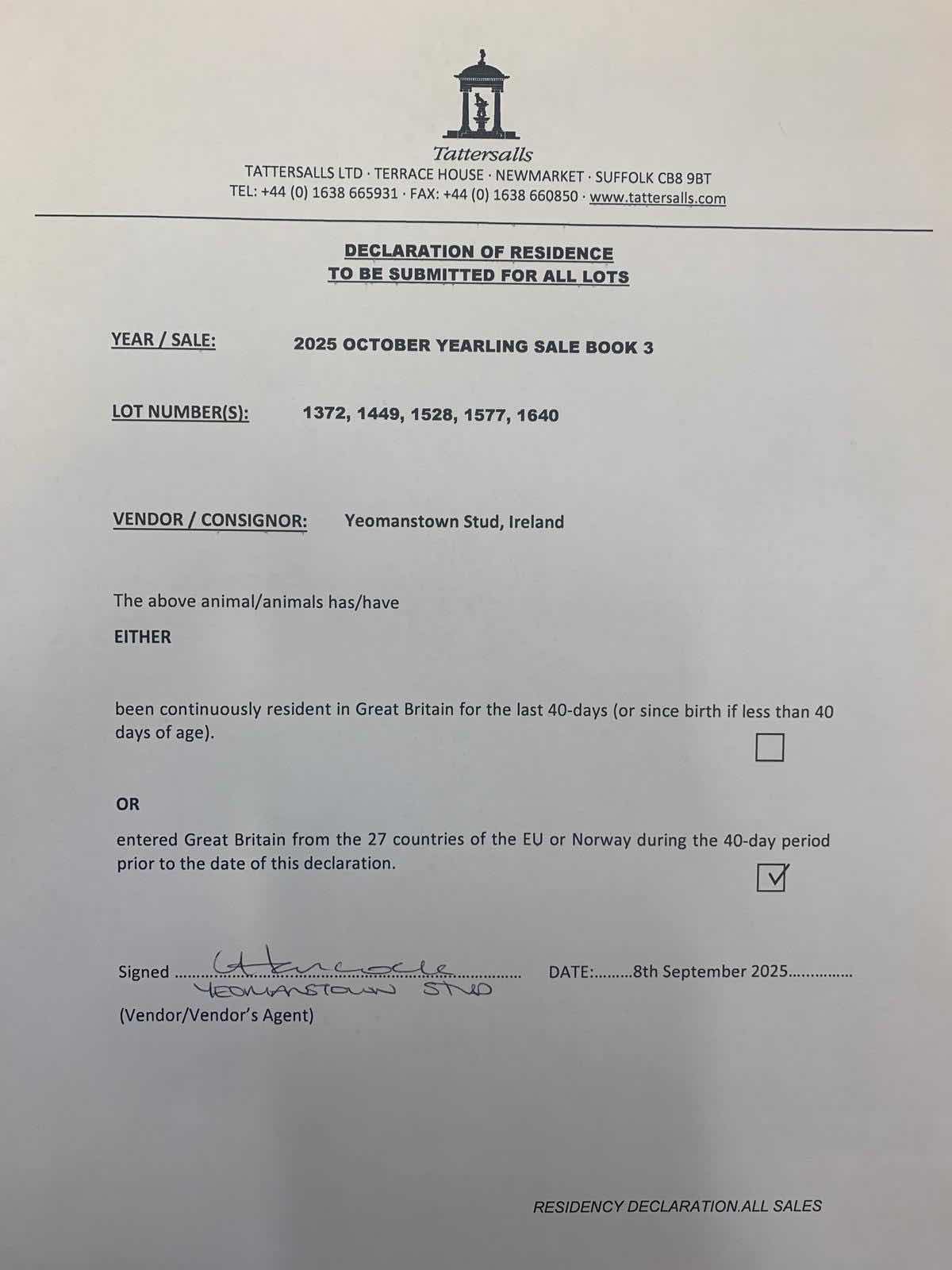 Consignor: Yeomanstown Stud, Ireland