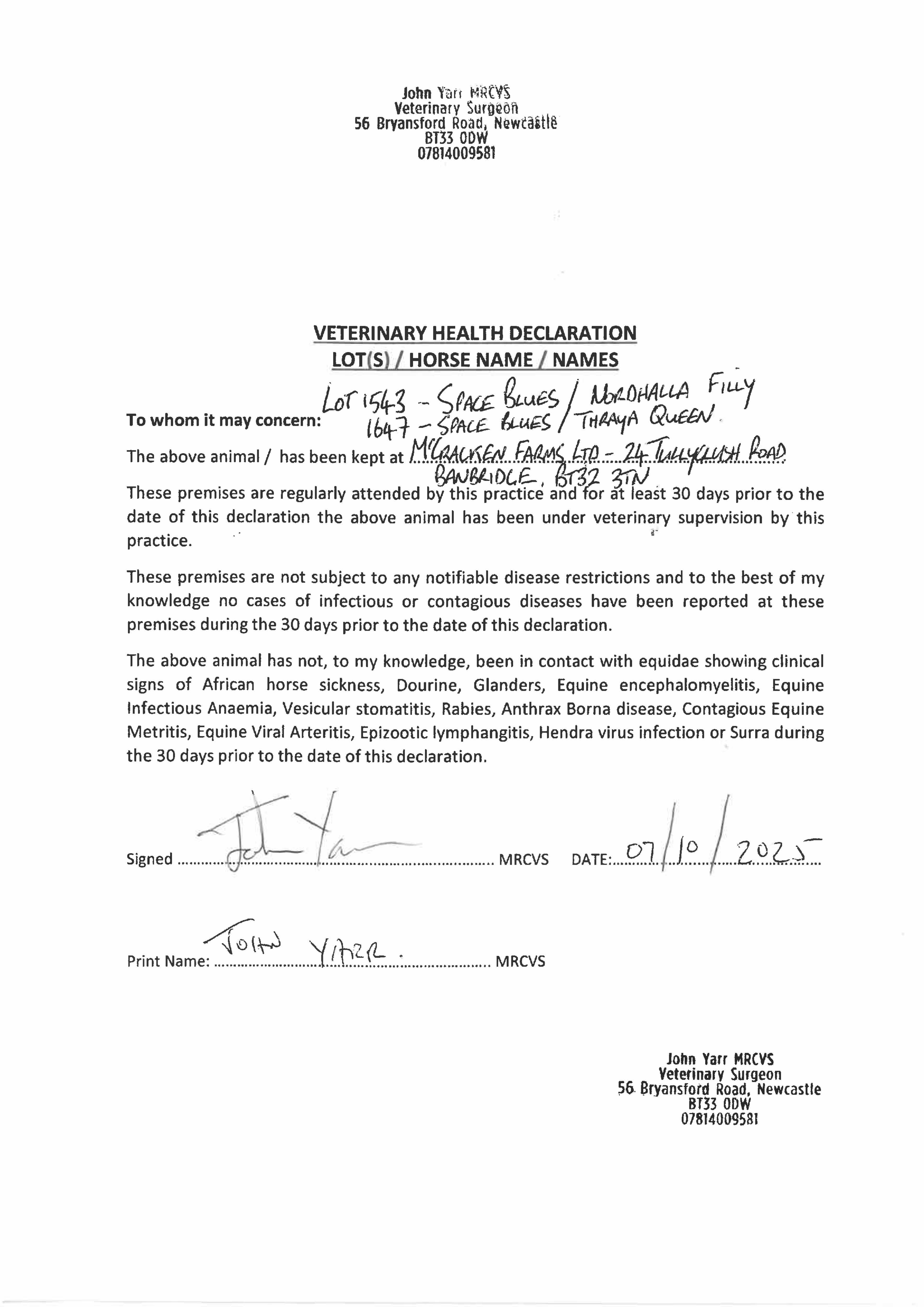 Official Veterinarian Declaration