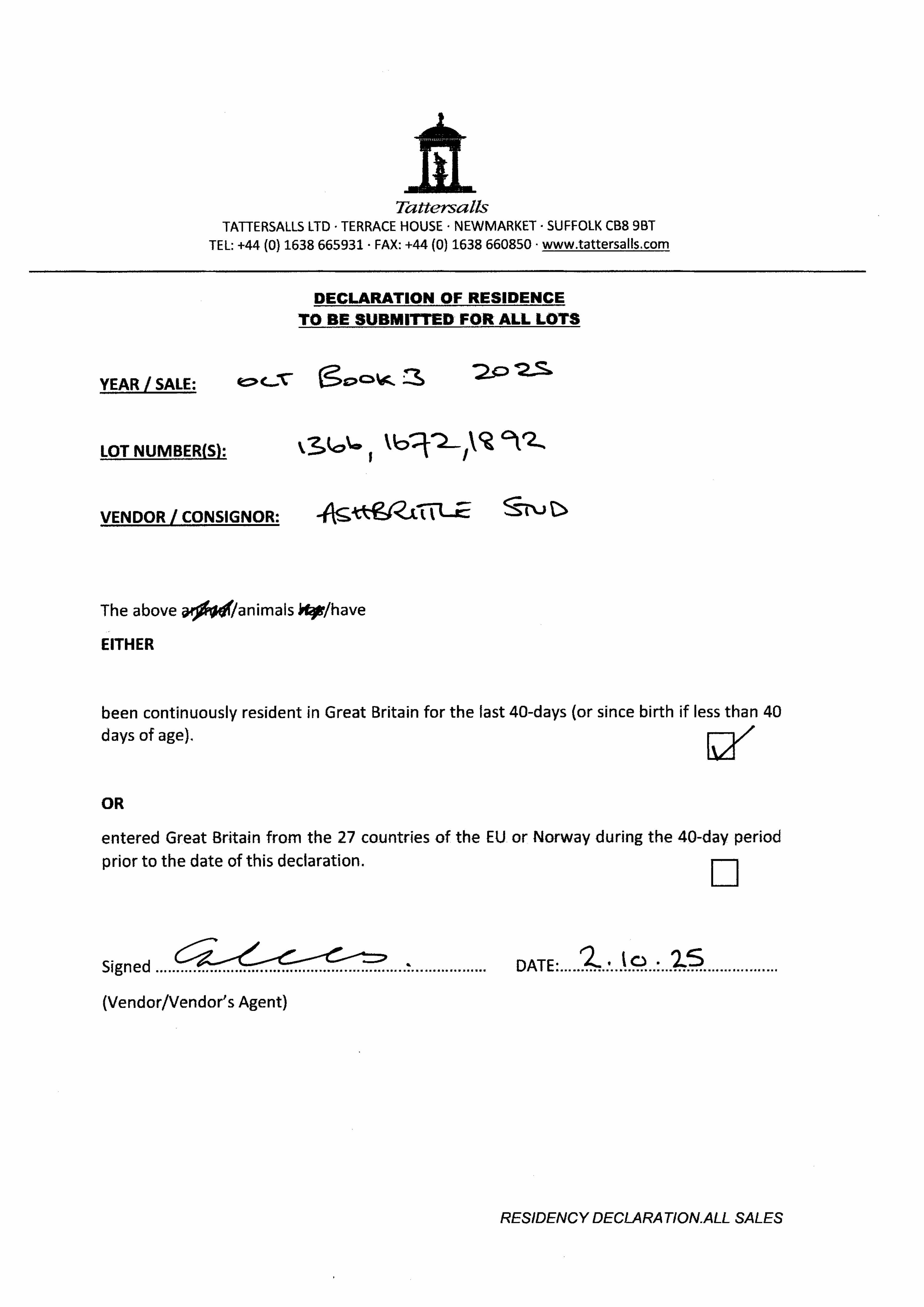 Consignor: Ashbrittle Stud