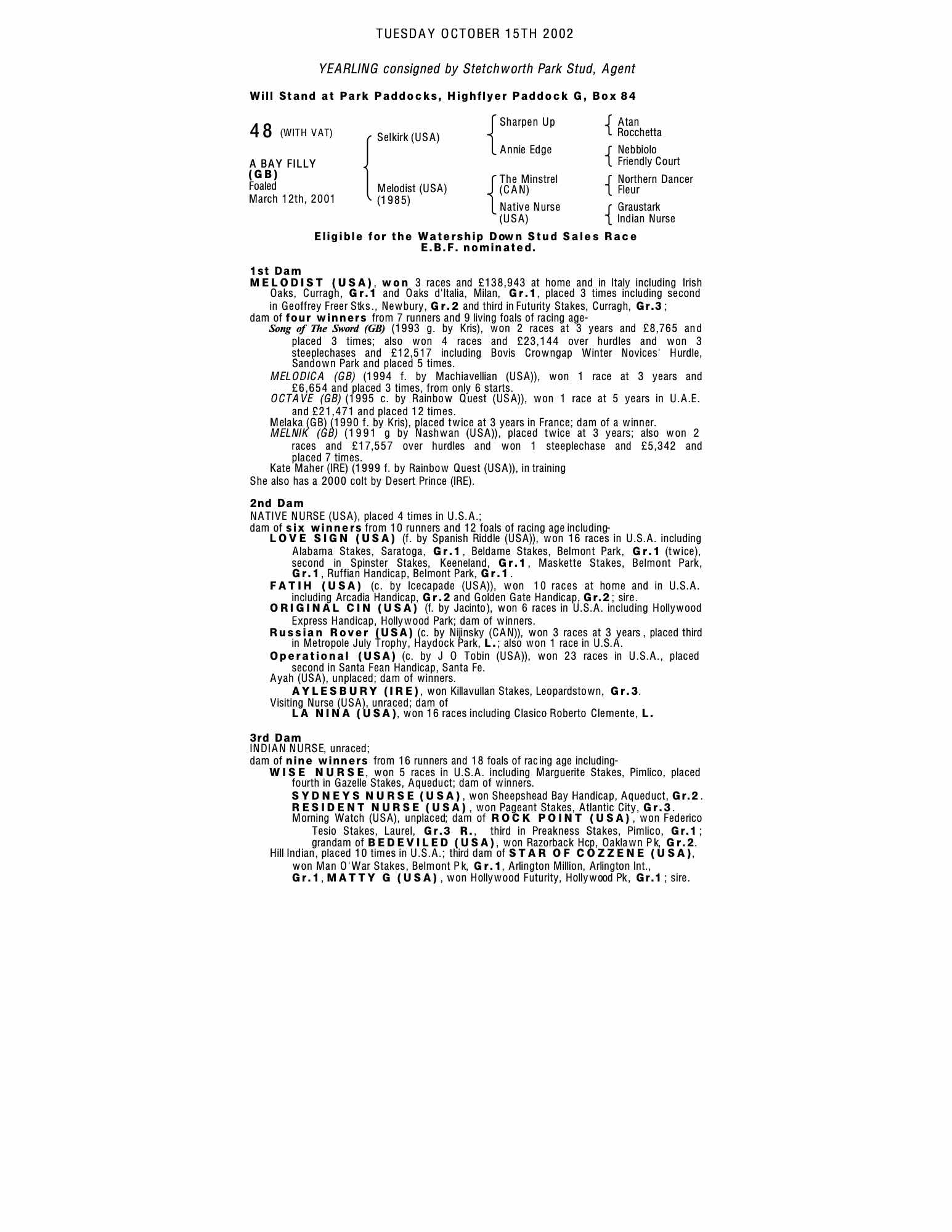 December Yearling Sale 2000 lot 103 F. by Rainbow Quest (USA) , Stetchworth Park Stud, Agent=>Vendor 10,000 gns