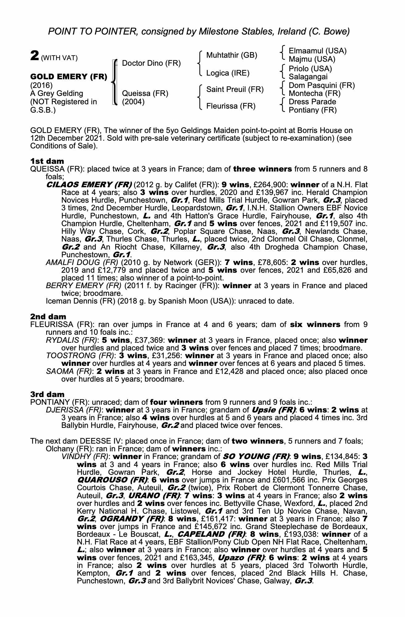 Online Sale - 19th January 2023 lot 44 Cilaos Emery (FR) (G. by Califet (FR)), Closutton Stables, Ireland (W. Mullins)=>Vendor 35,000 gns