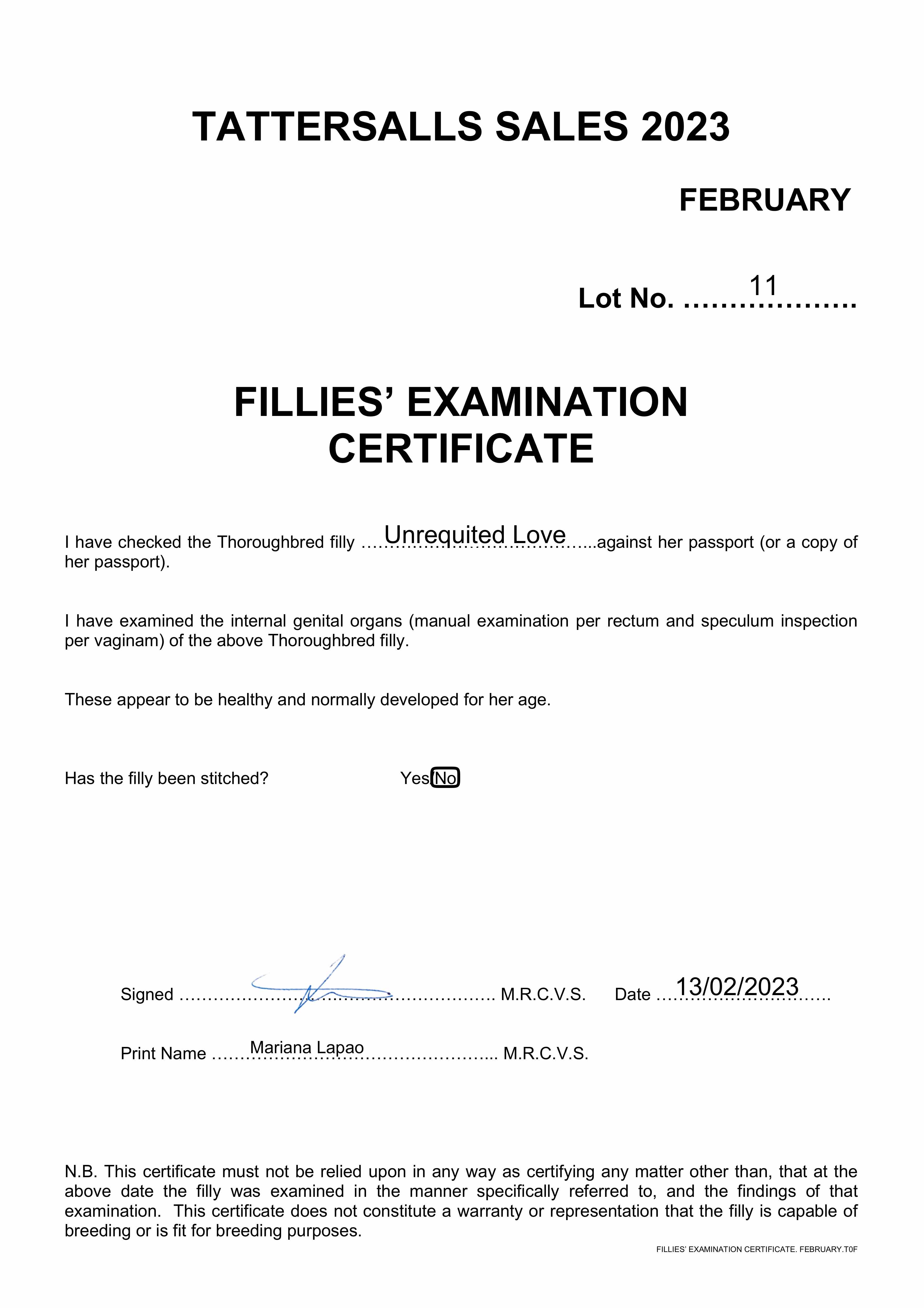 Vendor's Notes: Filly out of training. Suitable for breeding.
