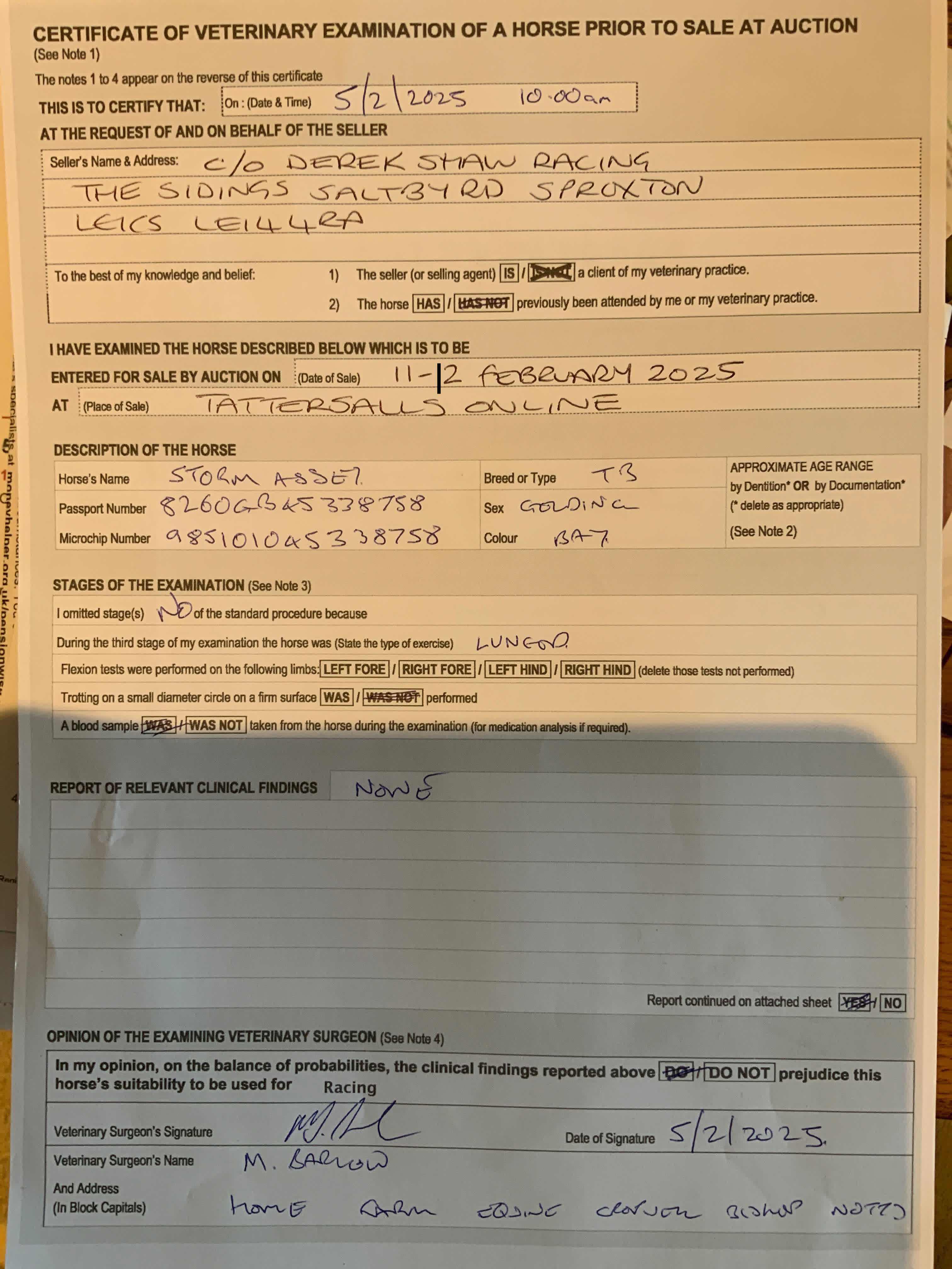 Vendor's Notes: Storm Asset is in Training and fit and ready to continue to race.