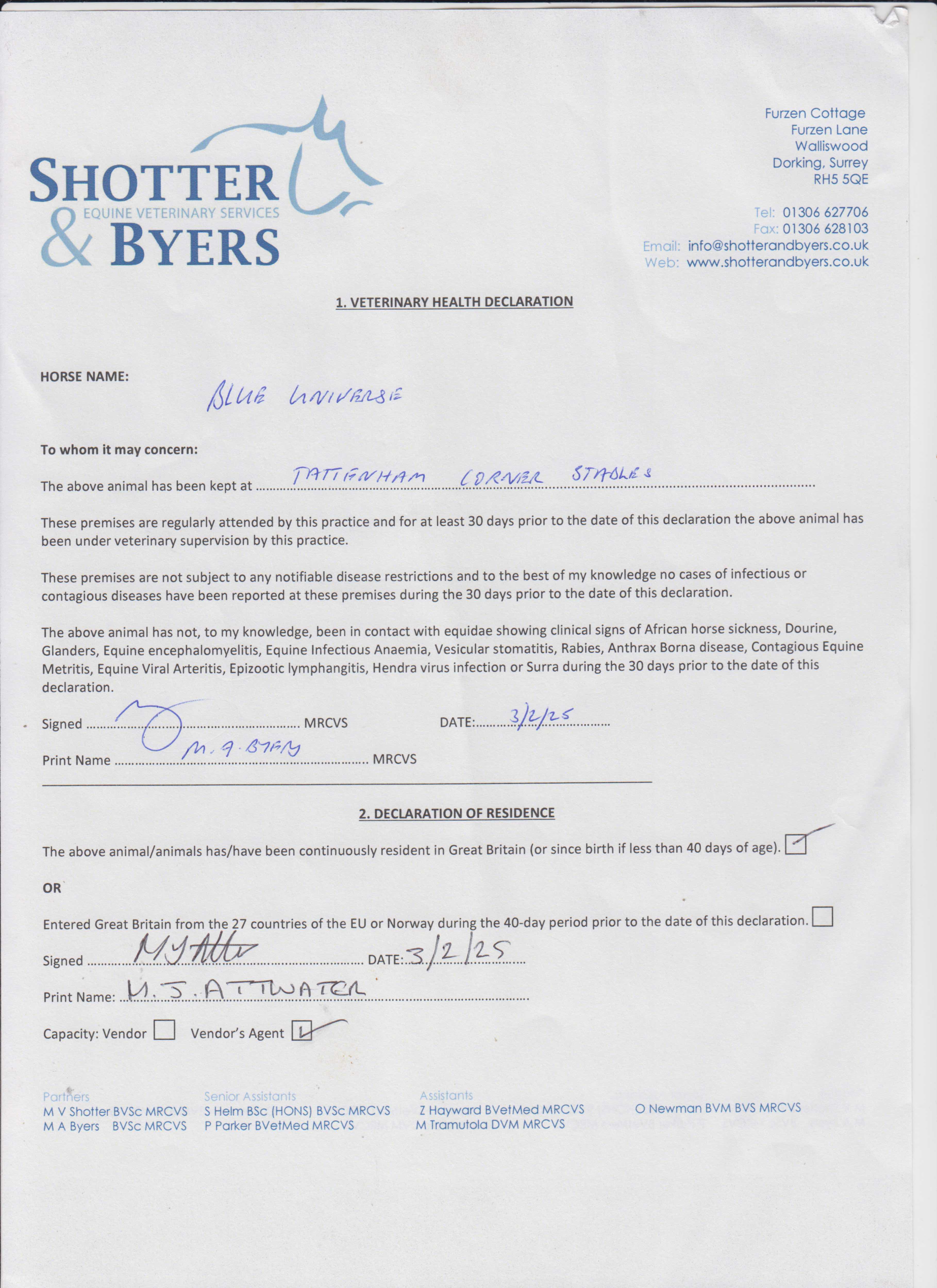 Vices/Declarations: Has been heard to make a noise. Has had a hobday operation.