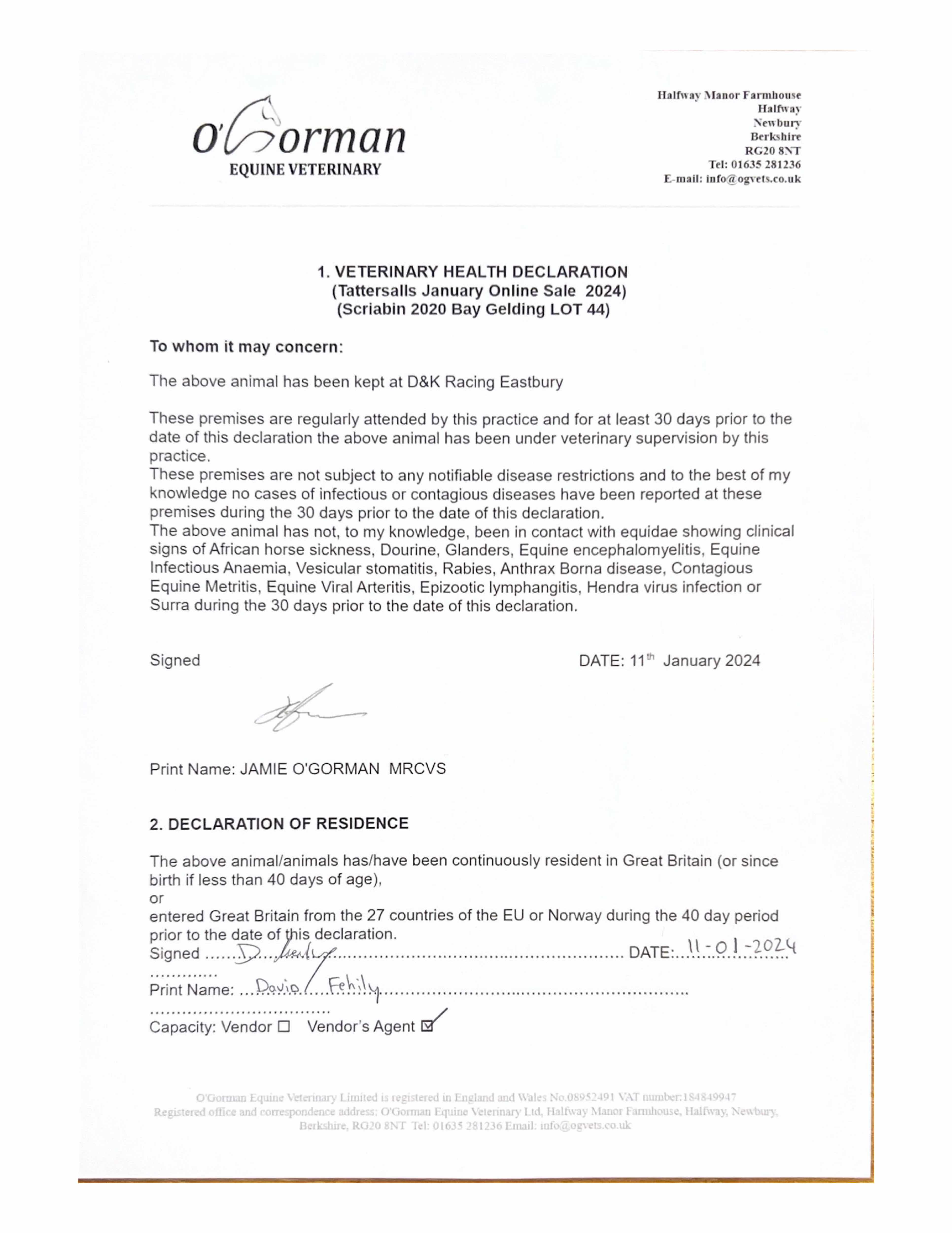 Wednesday 17 January:  The influenza vaccinations do not comply with the current BHA requirements and further vaccinations will be required before this animal can race in the UK.