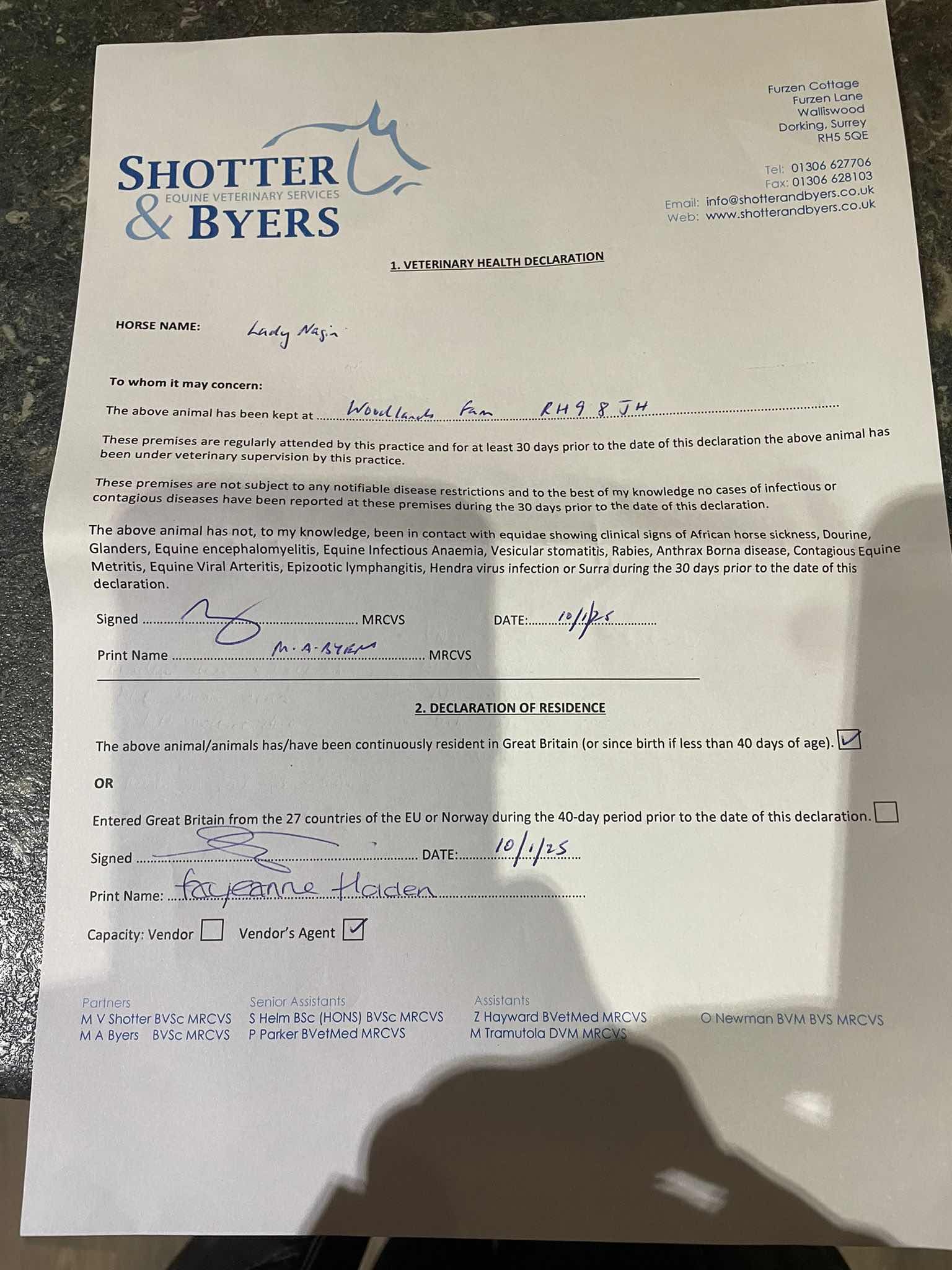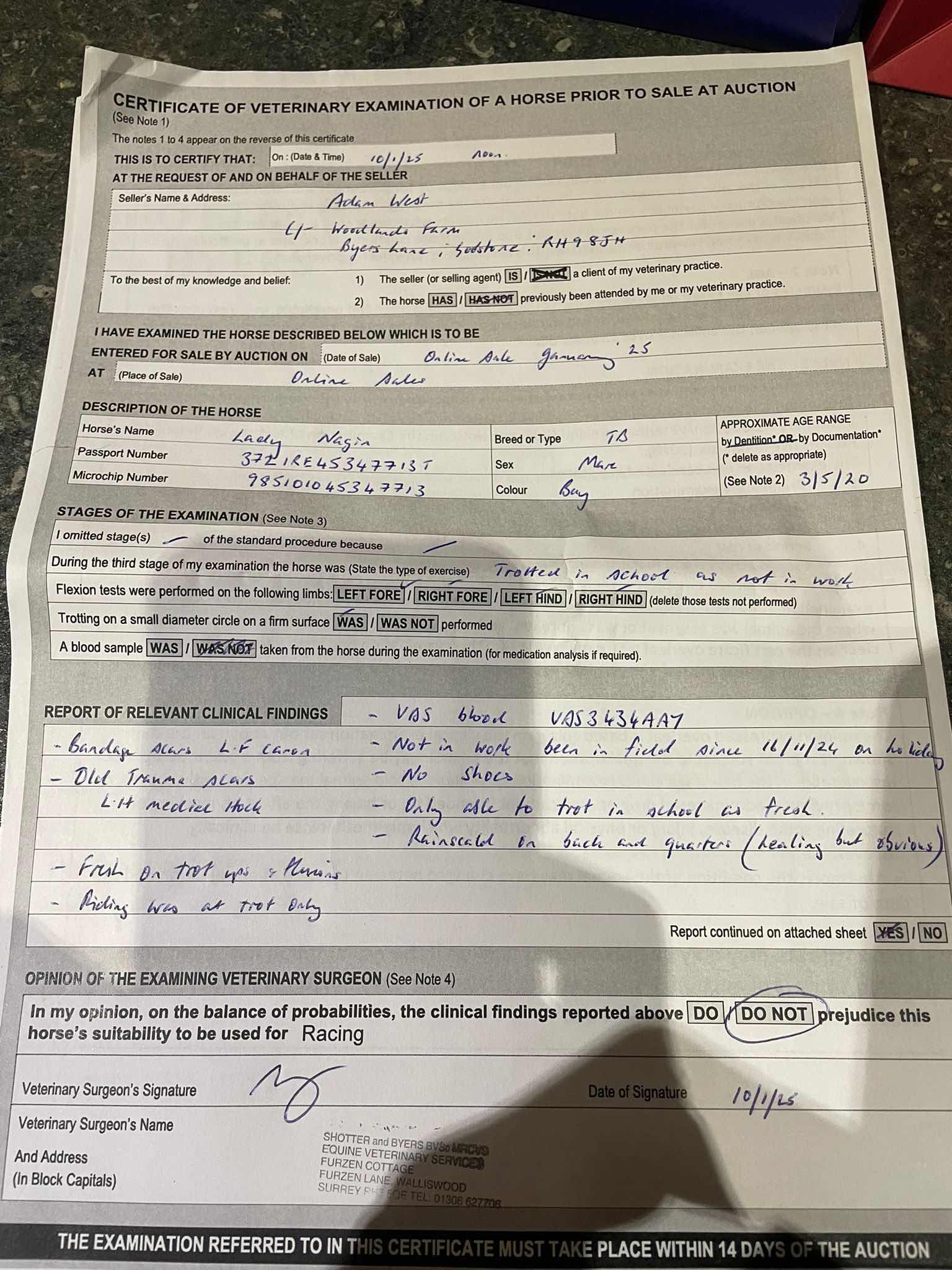 Vices/Declarations: Has been seen to Box-Walk. EIA Coggins test results pending.