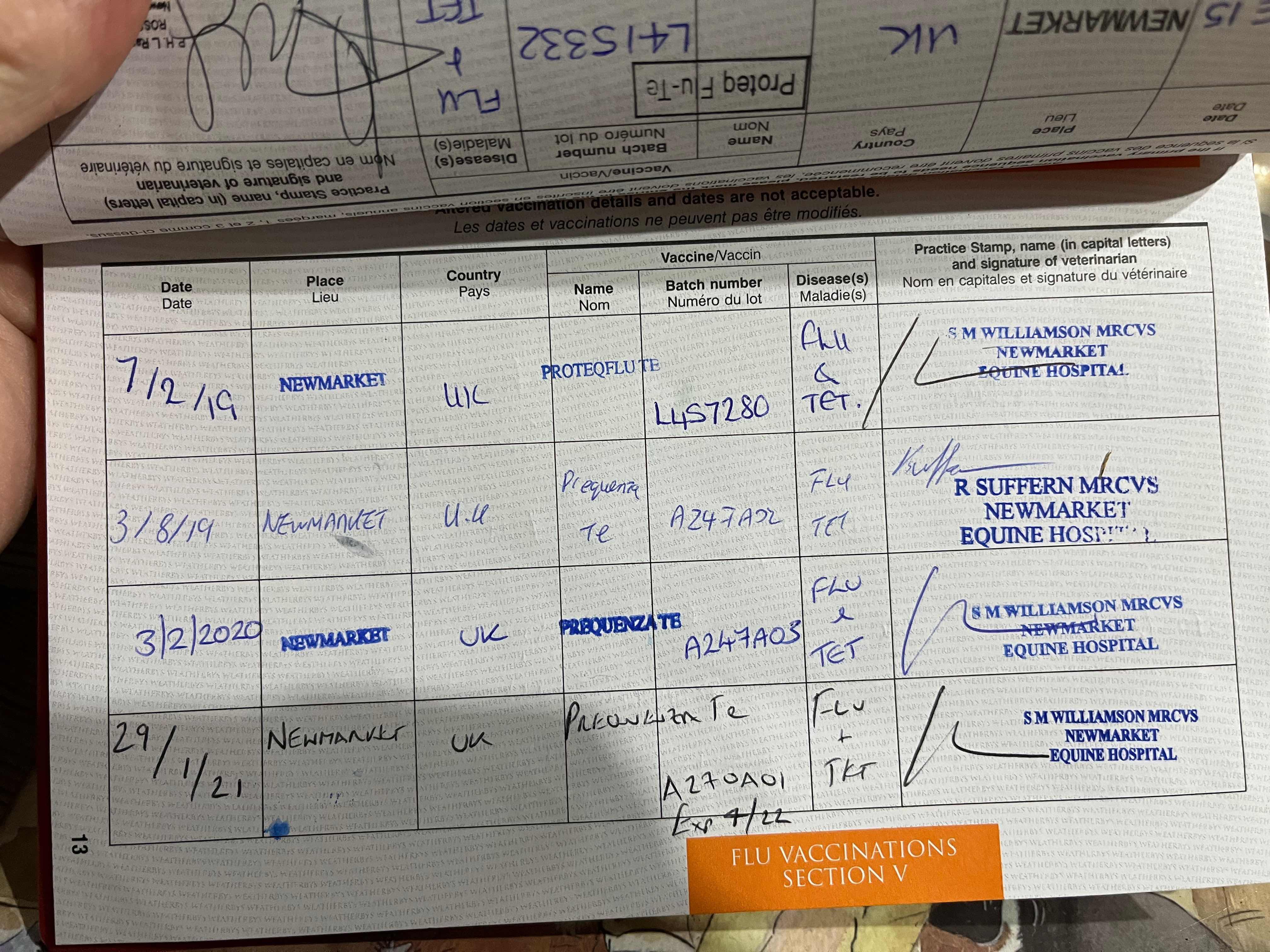 Vices/Declarations: This lot is not vaccinated in accordance with the current BHA influenza requirements and further vaccinations will be required before it is compliant. No valid EIA Coggins received.