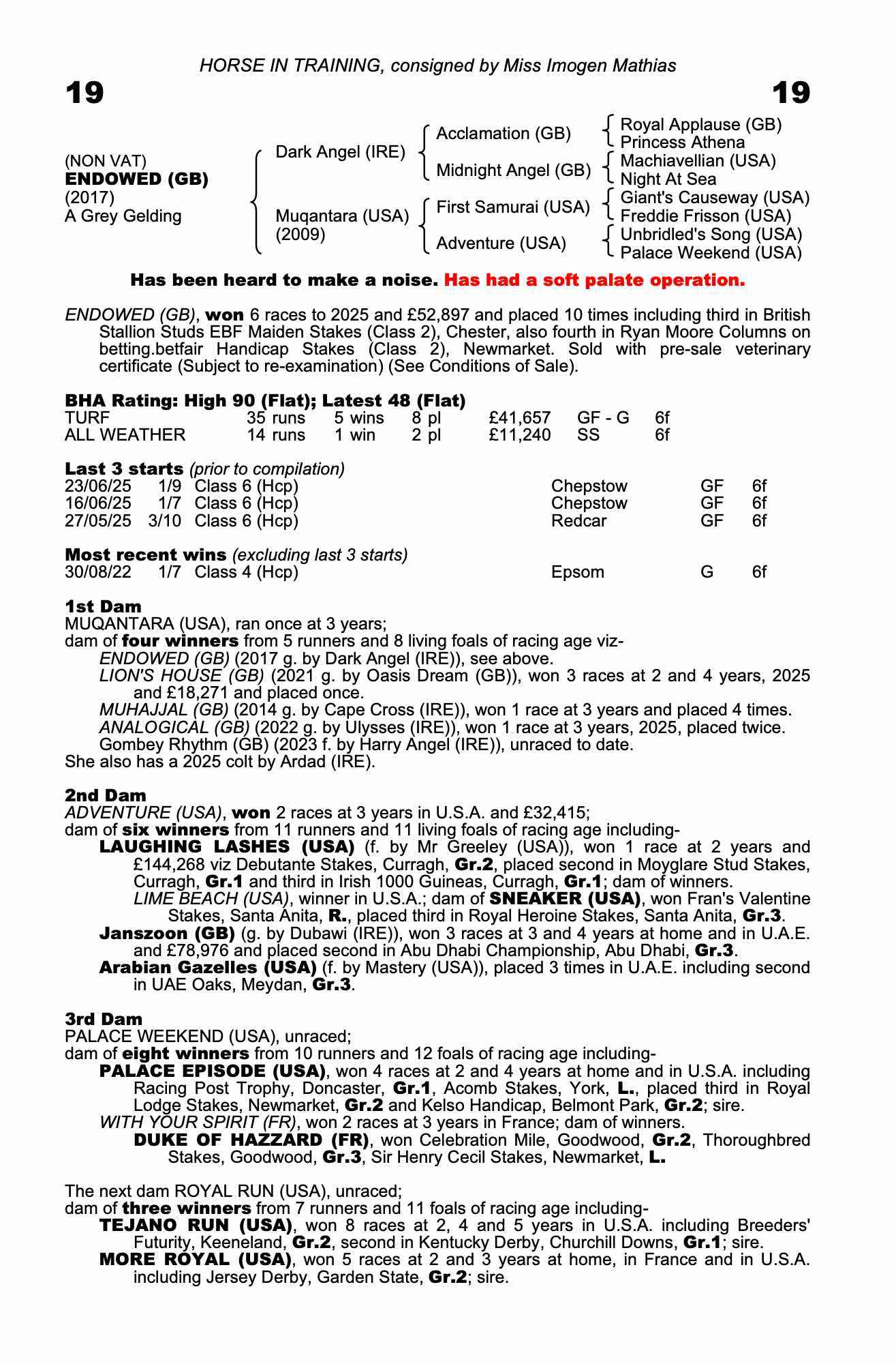 Vices/Declarations: Has been heard to make a noise. Has had a soft palate operation. No valid EIA Coggins received.