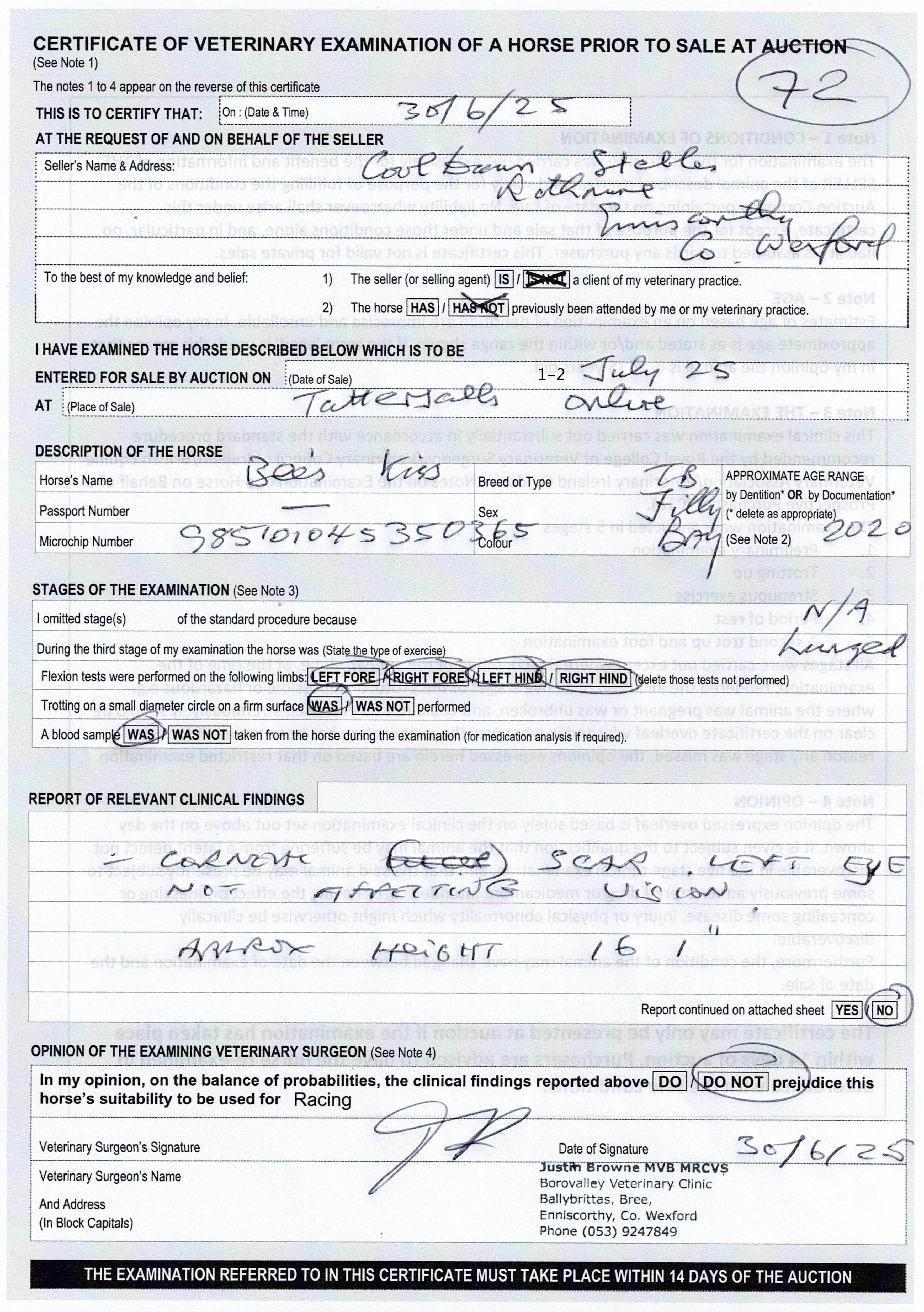 Vendor's Notes: had finished third on debut at Ballinaboola, but she had slightly lost her way with two pulled-up efforts before bouncing back to form in no uncertain terms here. The five-year-old daughter of Ol' Man River appeared to relish the better ground and returned to form with a commanding victory. Always prominent, she quickened smartly from the back of three out, with only the favourite able to go with her before crashing out at two out. Despite this, Bees Kiss still looked to be travelling best and stayed on strongly to win well, delivering a polished round of jumping. A well-related mare, this was a smart performance, and she looks sure to build on this initial success when switching to the track.
