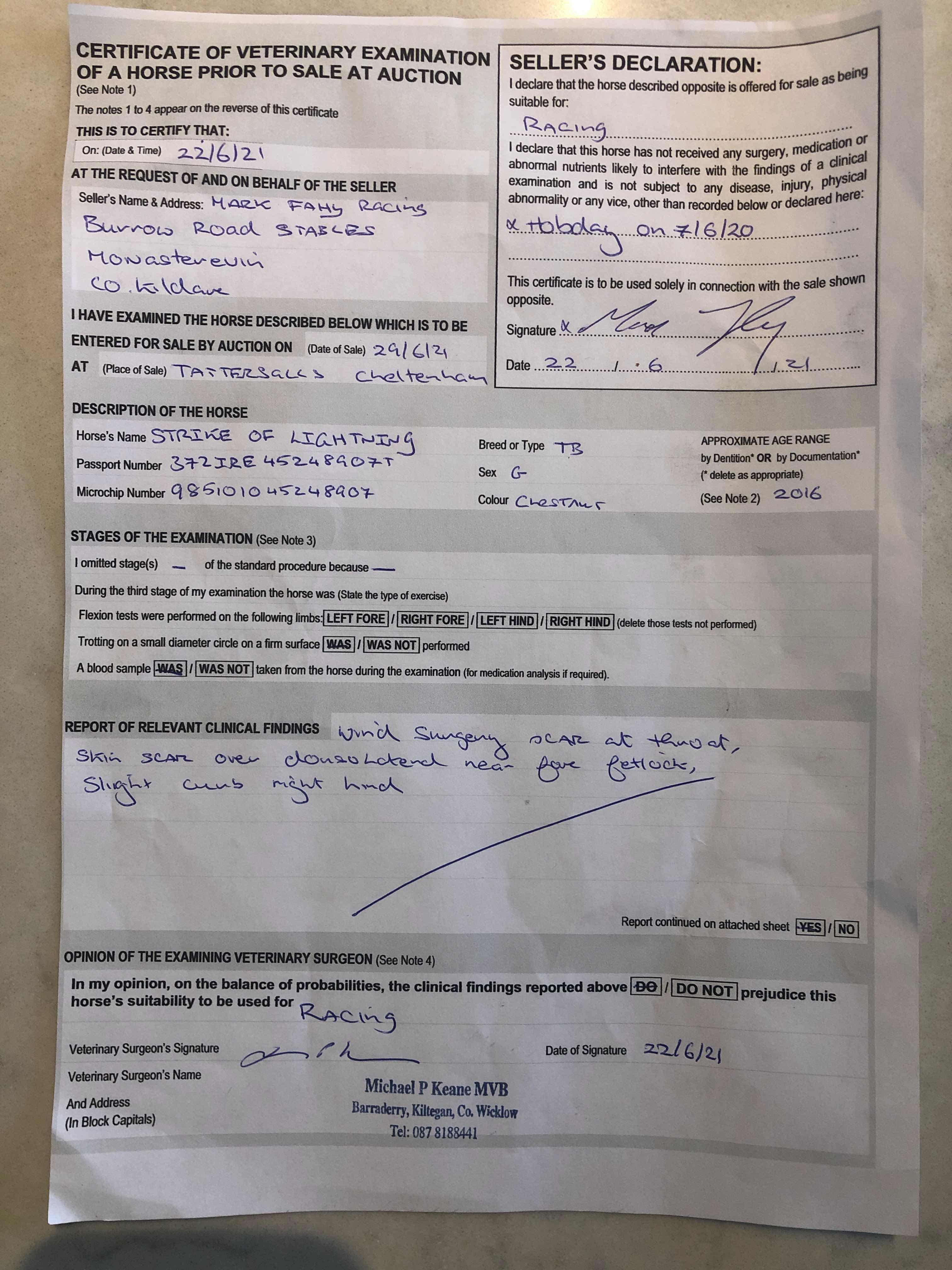 Vendor's Notes: Strike of lightning had a successful hobday operation on the 7/6/20 he has only 2 career starts to date finishing 2nd in a point to point and 3rd in a bumper he has a great temperament and has ran and schooled great over fences..