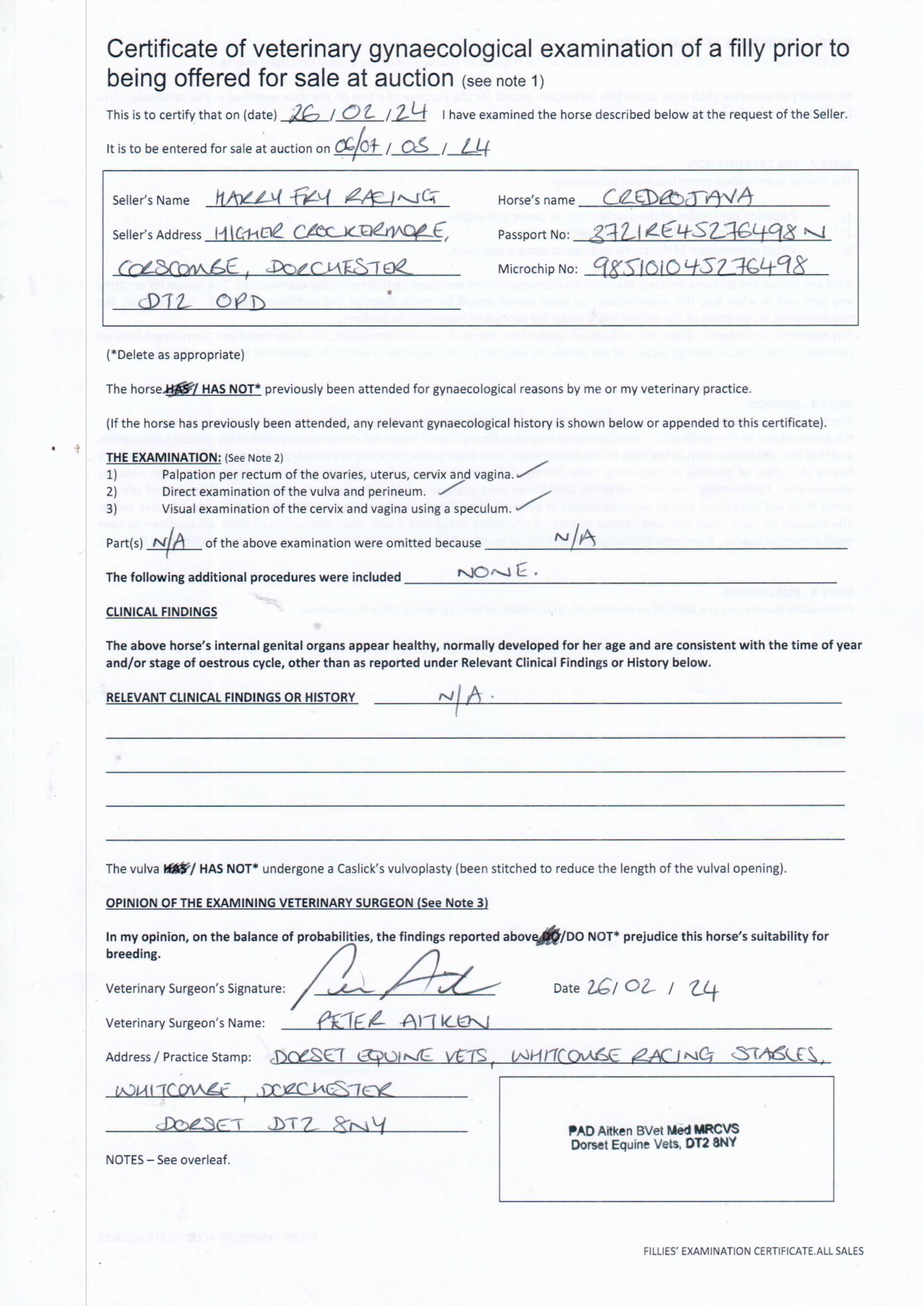 Vendor's Notes: A high class mare who will make an excellent broodmare with a good temperament, sold with a non-racing agreement and breeding certificate.