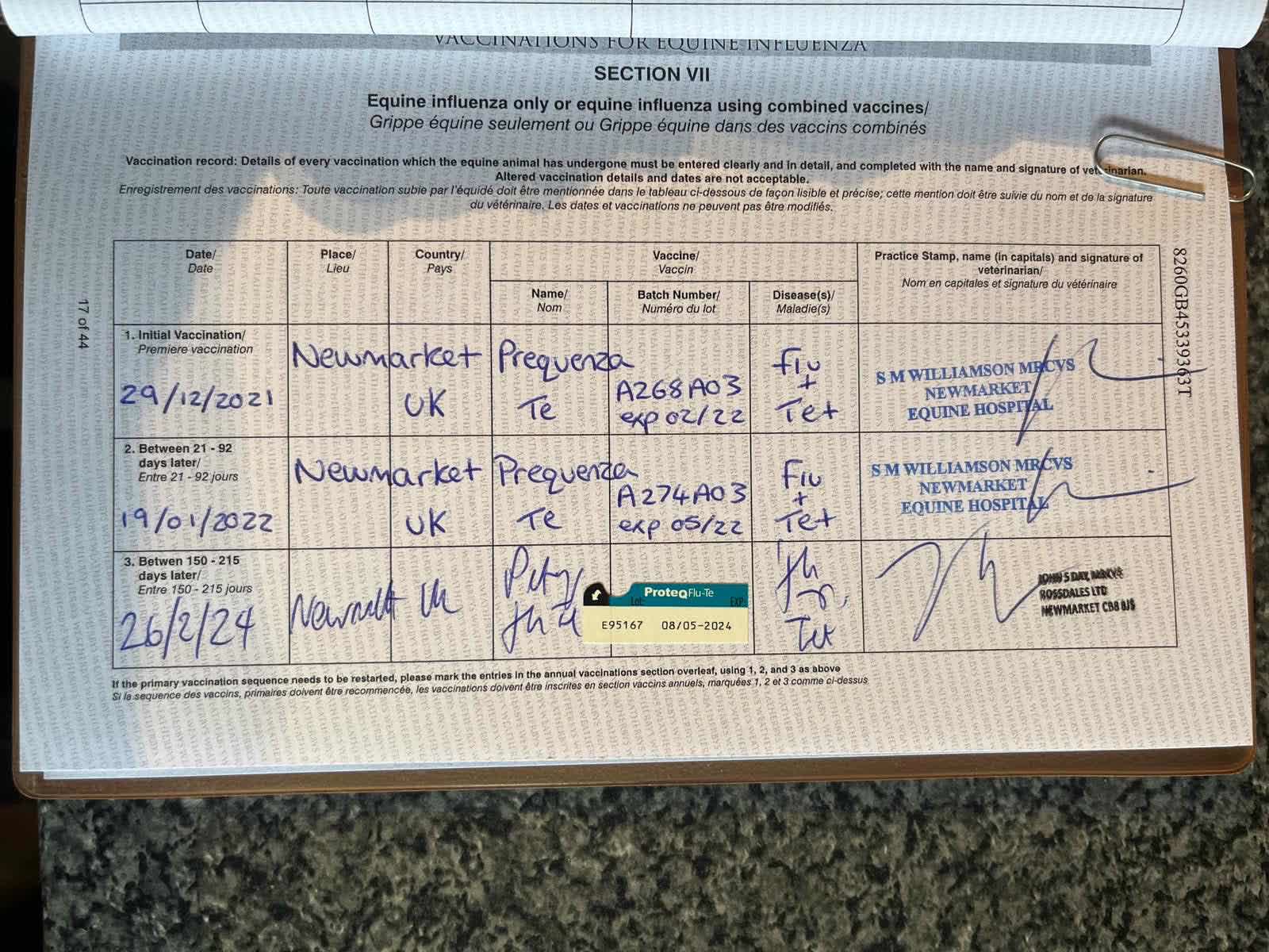 Vices/Declarations: The influenza vaccinations do not comply with the current BHA requirements and further vaccinations will be needed before this animal can enter racecourses