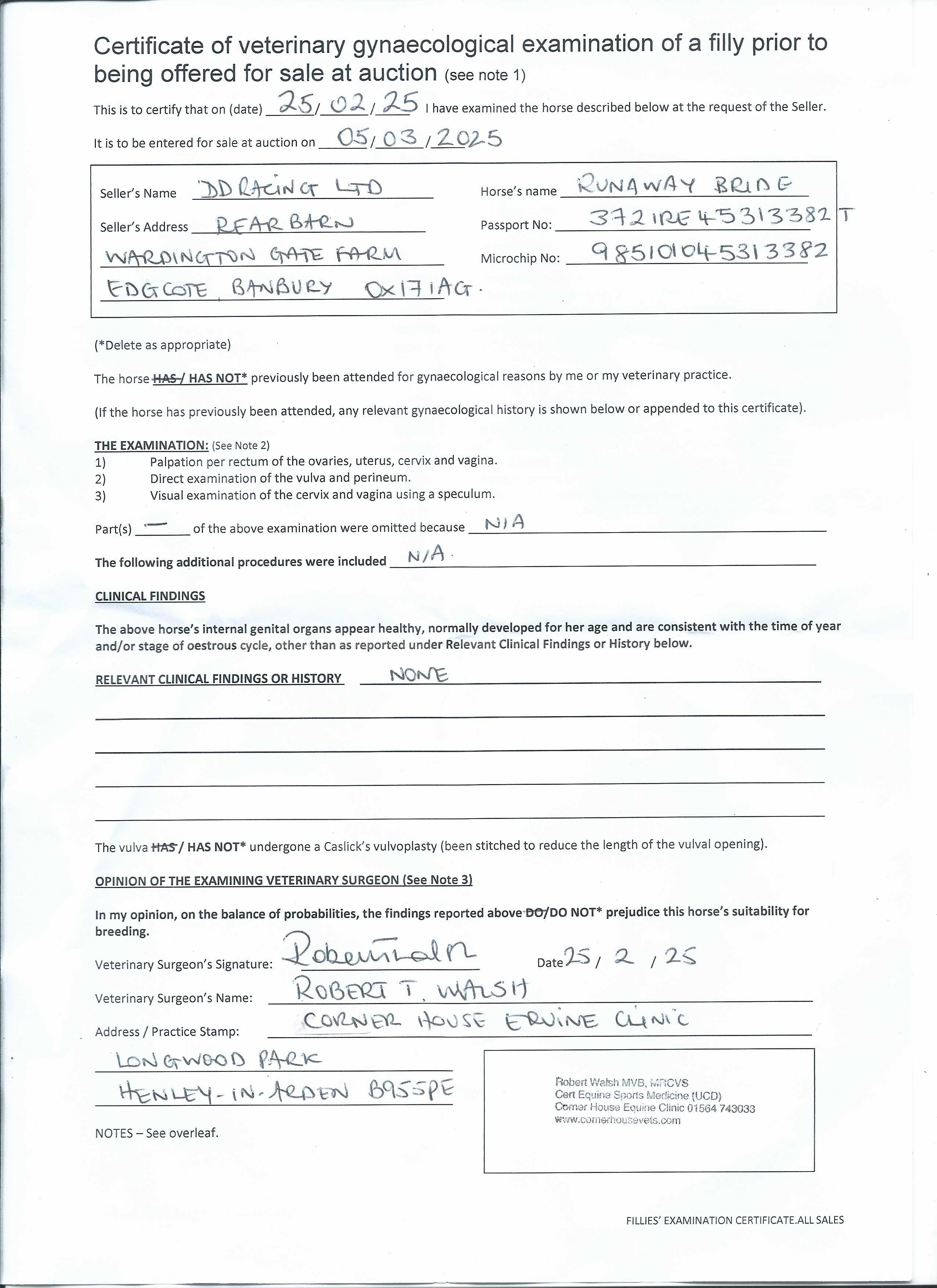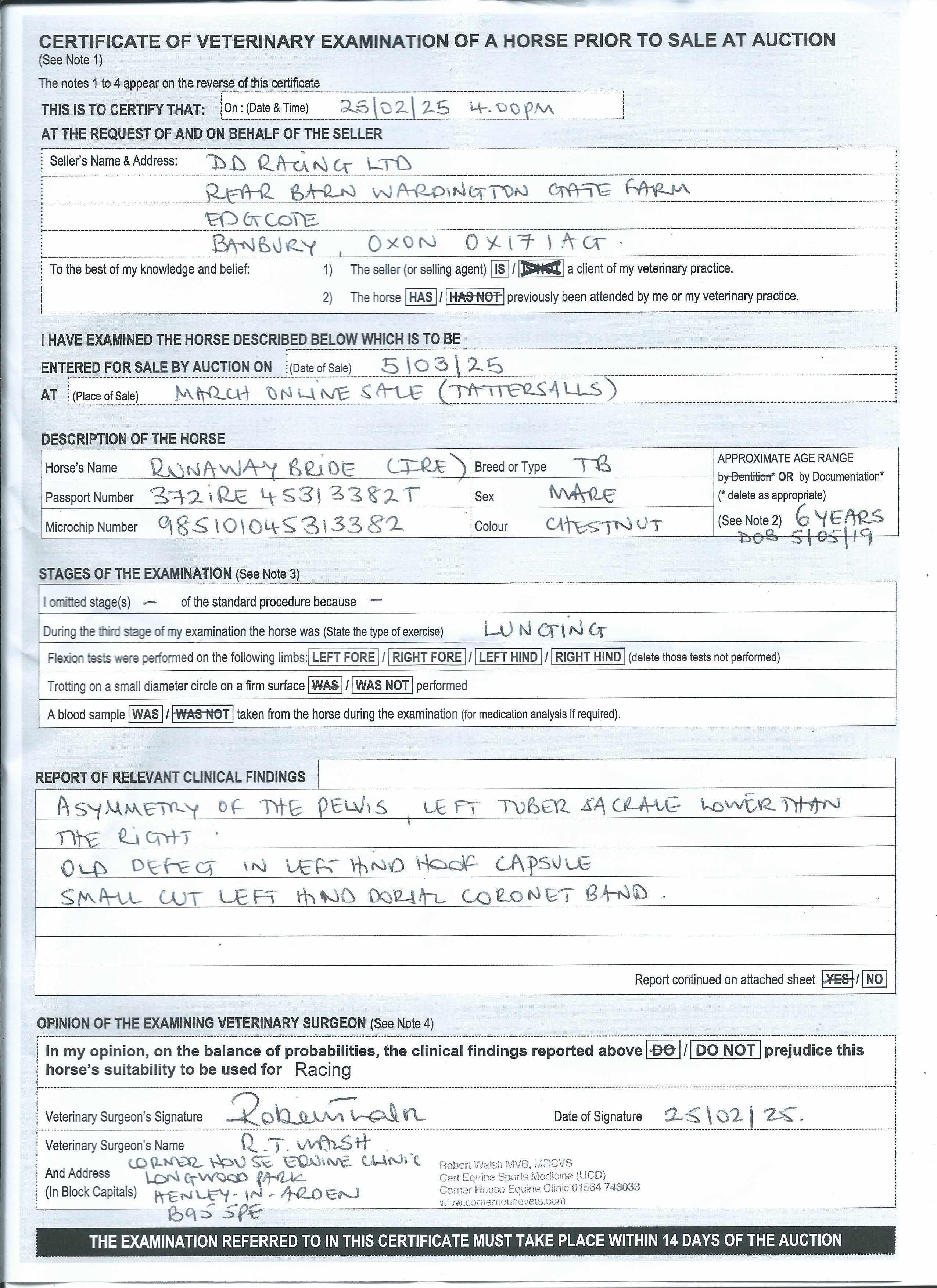 Vices/Declarations: Has had a soft palate operation. No valid EIA Coggins received.