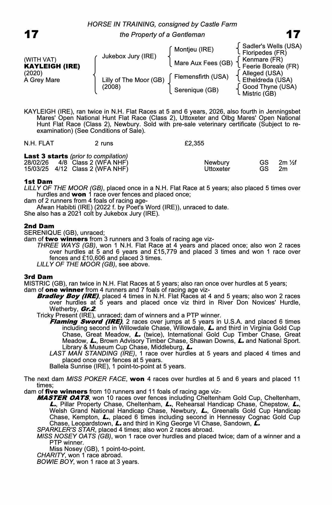 Vendor's Notes: 6-year-old mare by Jukebox Jury out of Lilly Of The Moor. Been given plenty of time to mature into an exciting prospect for novice hurdling and, ultimately, as a long distance chaser. Showed enormous promise in two class 2 bumpers over an insufficient 2 miles.