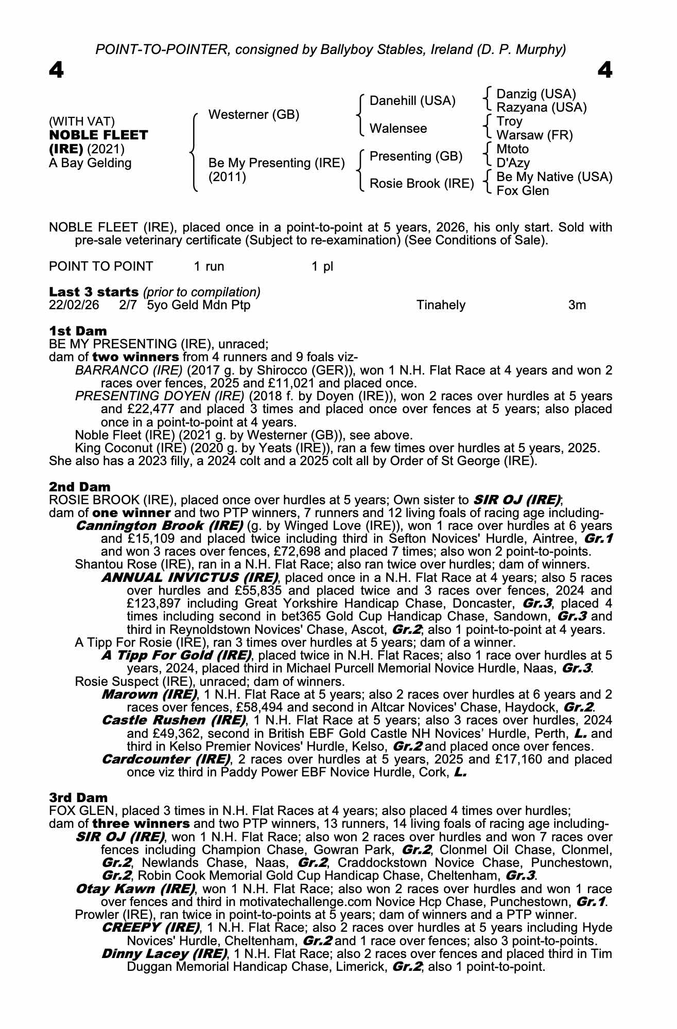 Vendor's Notes: Bought for €46,000 as a store, Noble Fleet made his debut at Tinahely, a course that his handler, Denis Murphy, tends to successfully target. Always to the fore, he raced upsides the eventual winner throughout the contest, with the pair skipping clear of their rivals on the long run to the home straight. They had the race between them at the second-last fence, and they remained locked together on the climb up the home straight. Given the narrow margins, an awkward leap at the final fence looked costly, as it allowed the eventual winner to edge half-a-length in front on the short run-in. The pair pulled 20 lengths clear of a previously placed rival, and, notably, the last previous winner of this maiden was last month’s Grade 2 Reynoldstown Novices’ Chase winner, The Jukebox Kid.