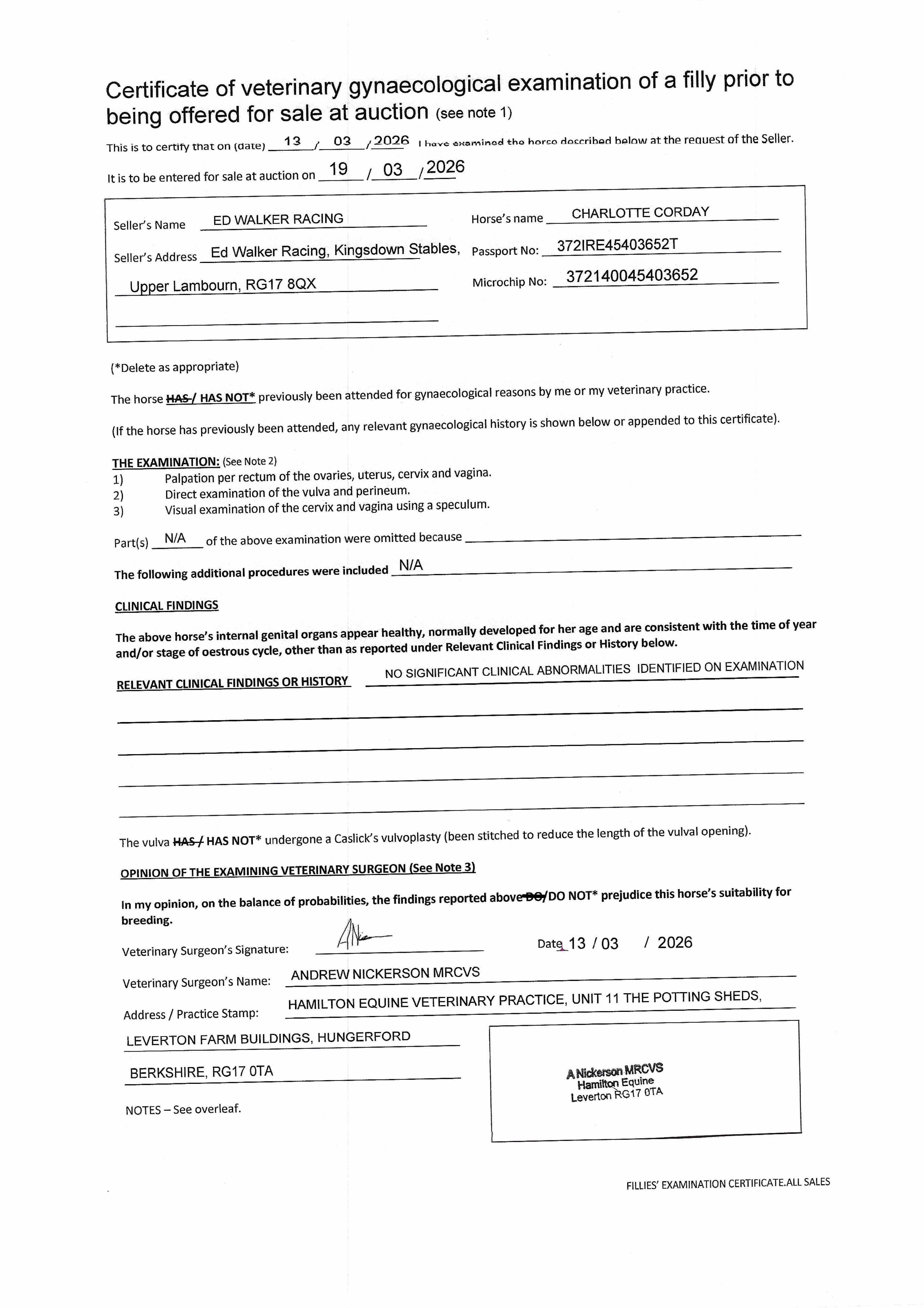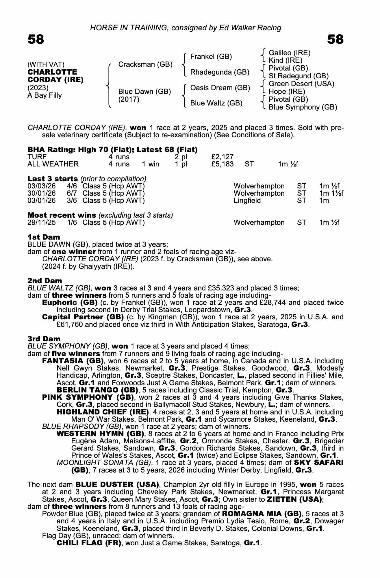 Vendor's Notes: Charlotte Corday is a tough, sound and genuine filly who has potential to offer more on the turf.