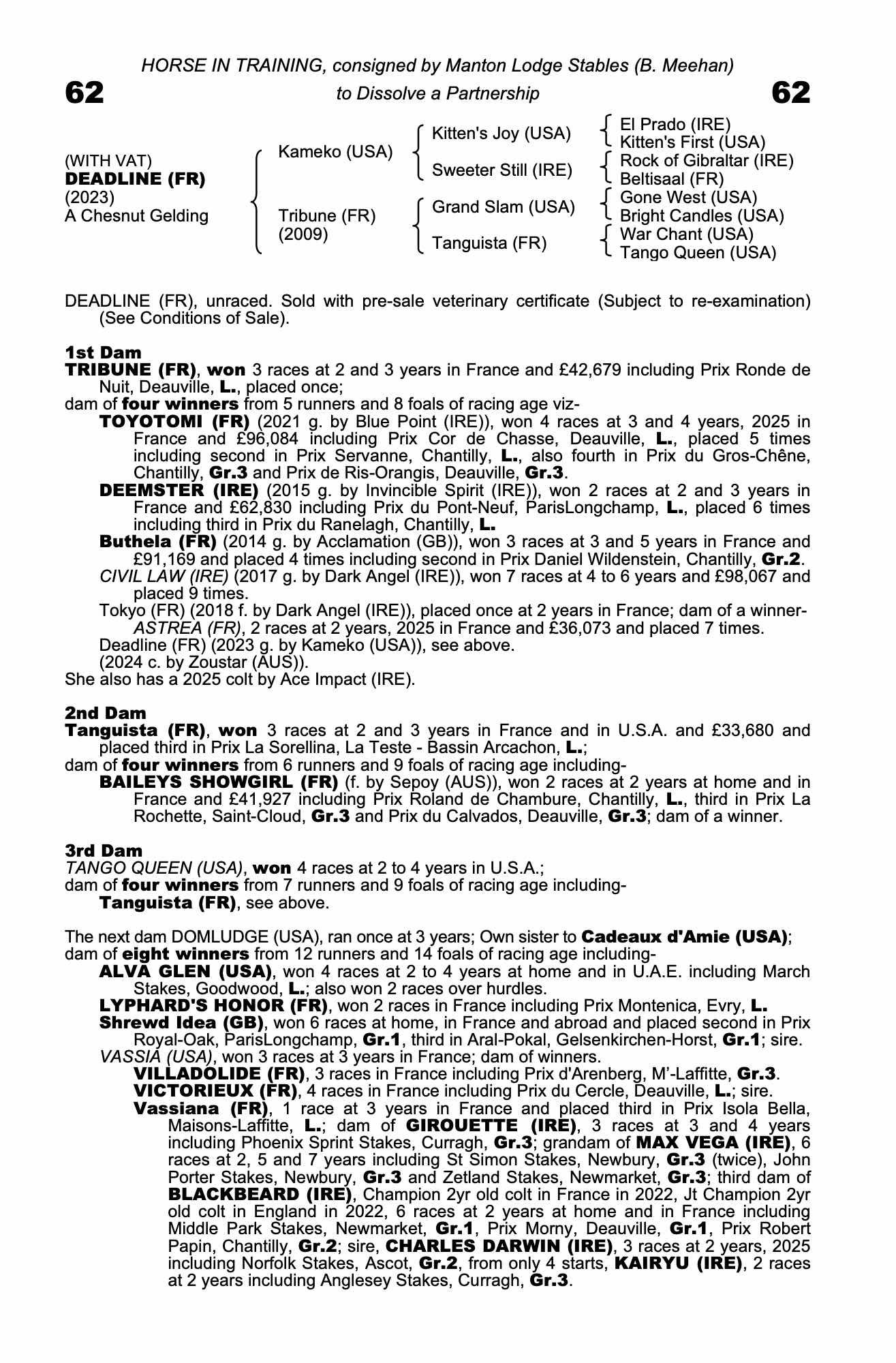 Vendor's Notes: Deadline is an unraced three - year - old gelding by Kameko, the 2000 Guineas winning sire of numerous smart performers. A well - related individual with plenty of physical scope, he remains an exciting prospect for the upcoming season. Offered for sale only to dissolve a partnership, Deadline represents an appealing opportunity for new connections to acquire a unraced son of a proven sire with his best days still ahead of him.