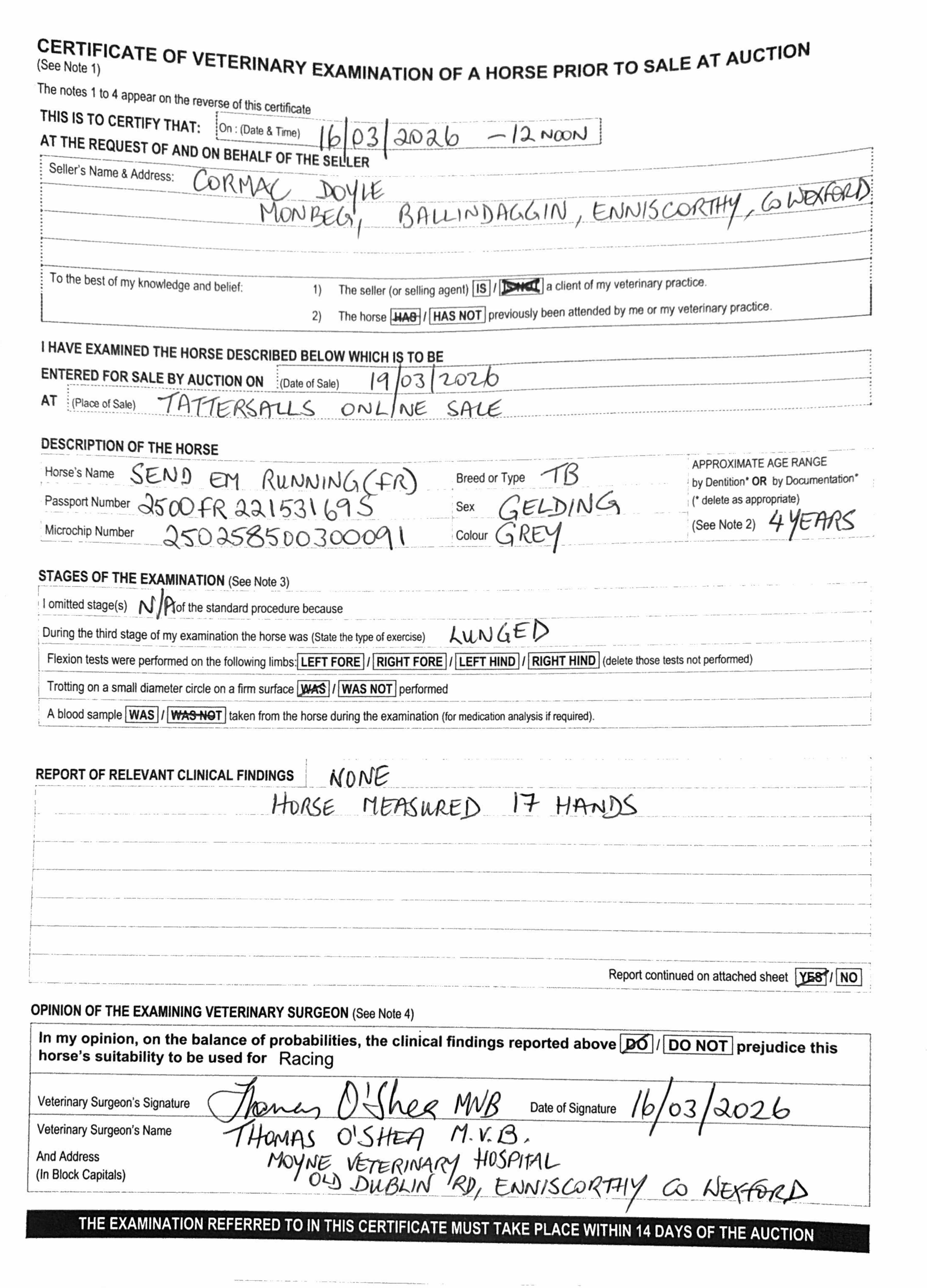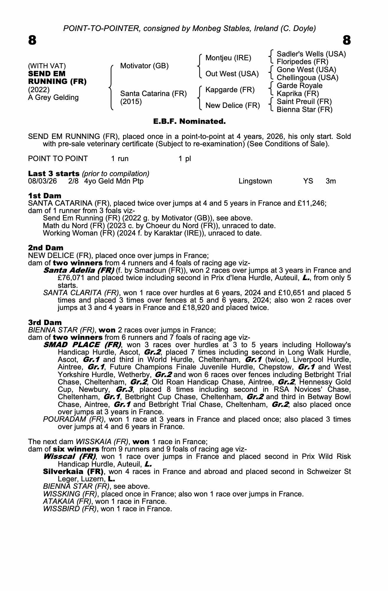 Vendor's Notes: Send Em Running is a grey son of Motivator who was clearly expected to put up a big showing as he was the big market mover ahead of his recent debut in Lingstown, where he was ultimately sent off as the even-money favourite. He raced to the fore throughout, holding a share of the lead when making a bad mistake at the fourth-last. Despite the error, he was back in front by the next, but it is hard not to feel like it did have an impact on his chances. Once getting headed by the eventual winner entering the home straight, he kept on to hold off the persistent challenge of the third in a promising introduction.