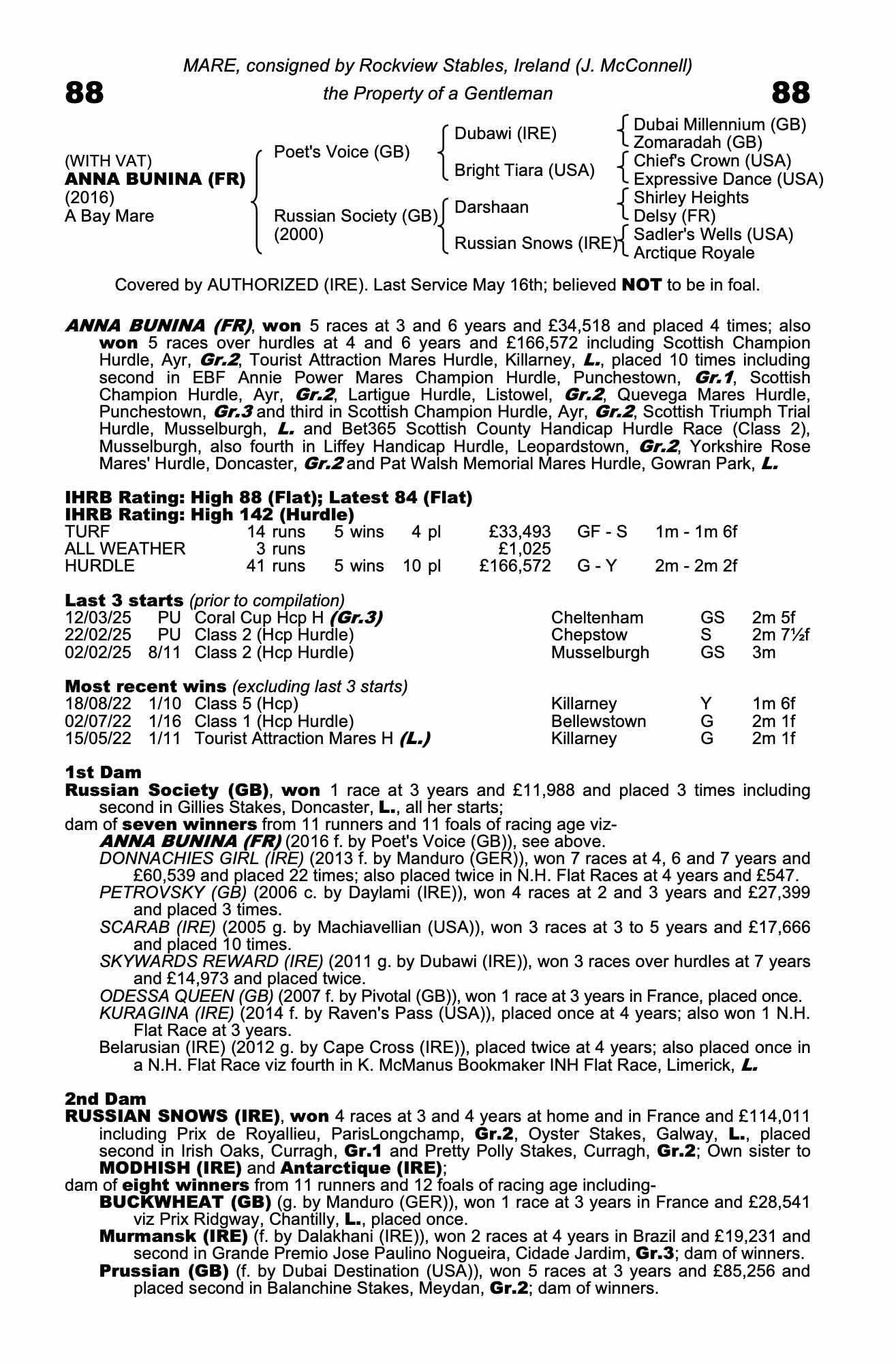 Vendor's Notes: High-class national hunt performer ANNA BUNINA is a multiple winner under both codes. The daughter of POET’S VOICE won the Grade 2 Scottish Champion Hurdle at Ayr and gained significant black type when finishing runner-up in the Grade 1 Annie Power Mares Champion Hurdle at the Punchestown Festival. She is out of the Listed placed RUSSIAN SOCIETY, herself a daughter of Group 2 winner and Group 1 Irish Oaks runner-up RUSSIAN SNOWS.