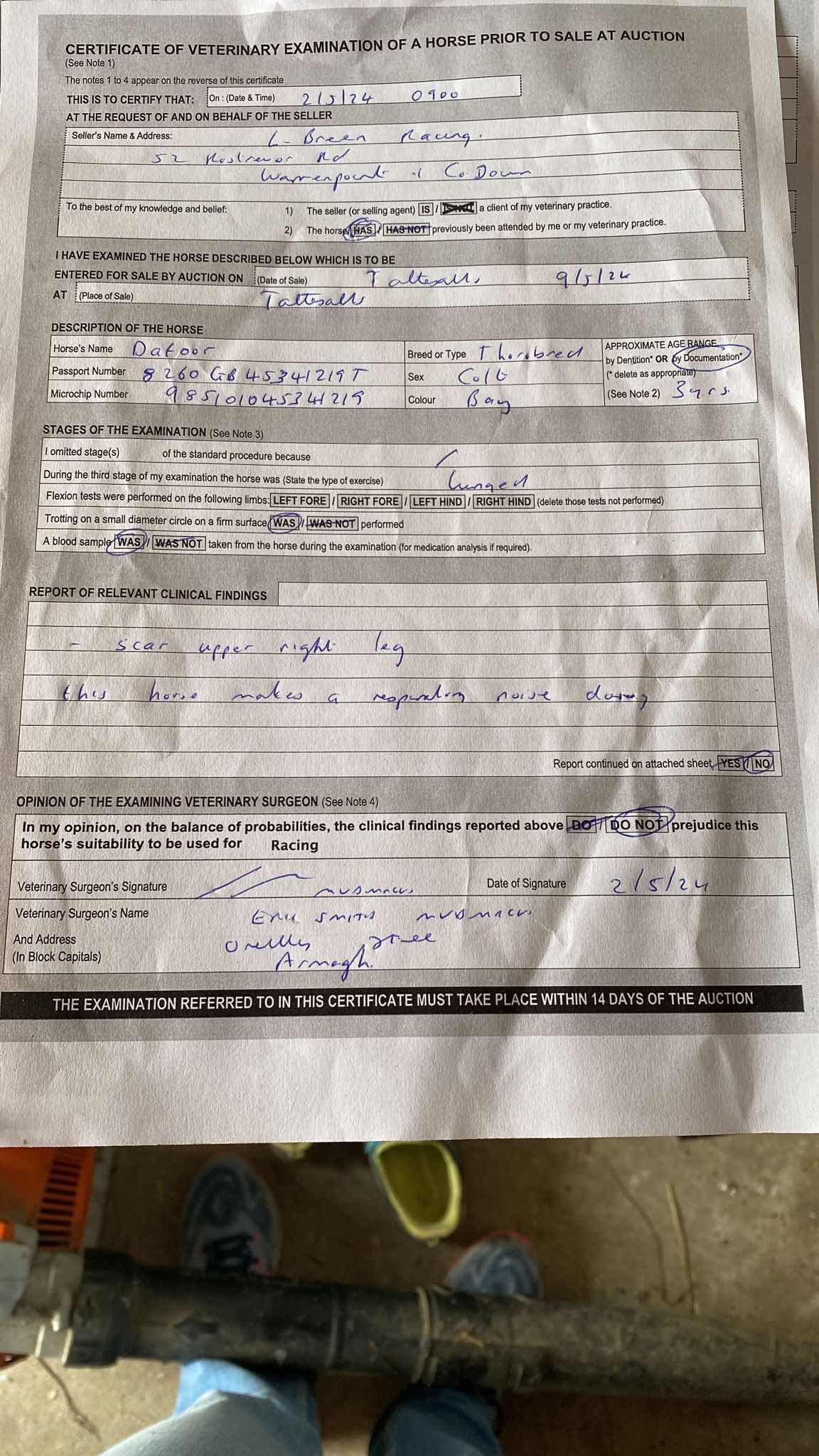 Vendor's Notes: 3 year old colt, lovely model of a horse. He has been in full training for 6 months.