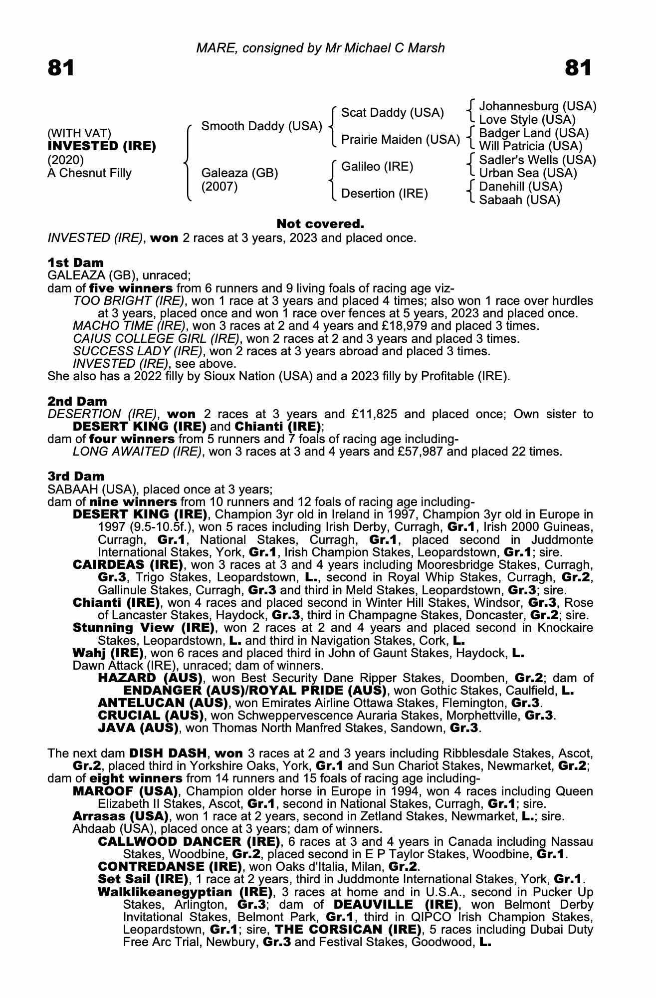 Vendor's Notes: 2 wins from 7 races. Invested was bought last year to continue racing but hasn't shown any spark in three races since. She will make a decent broodmare prospect being out of a Galileo mare and her mare has exciting youngsters to race.