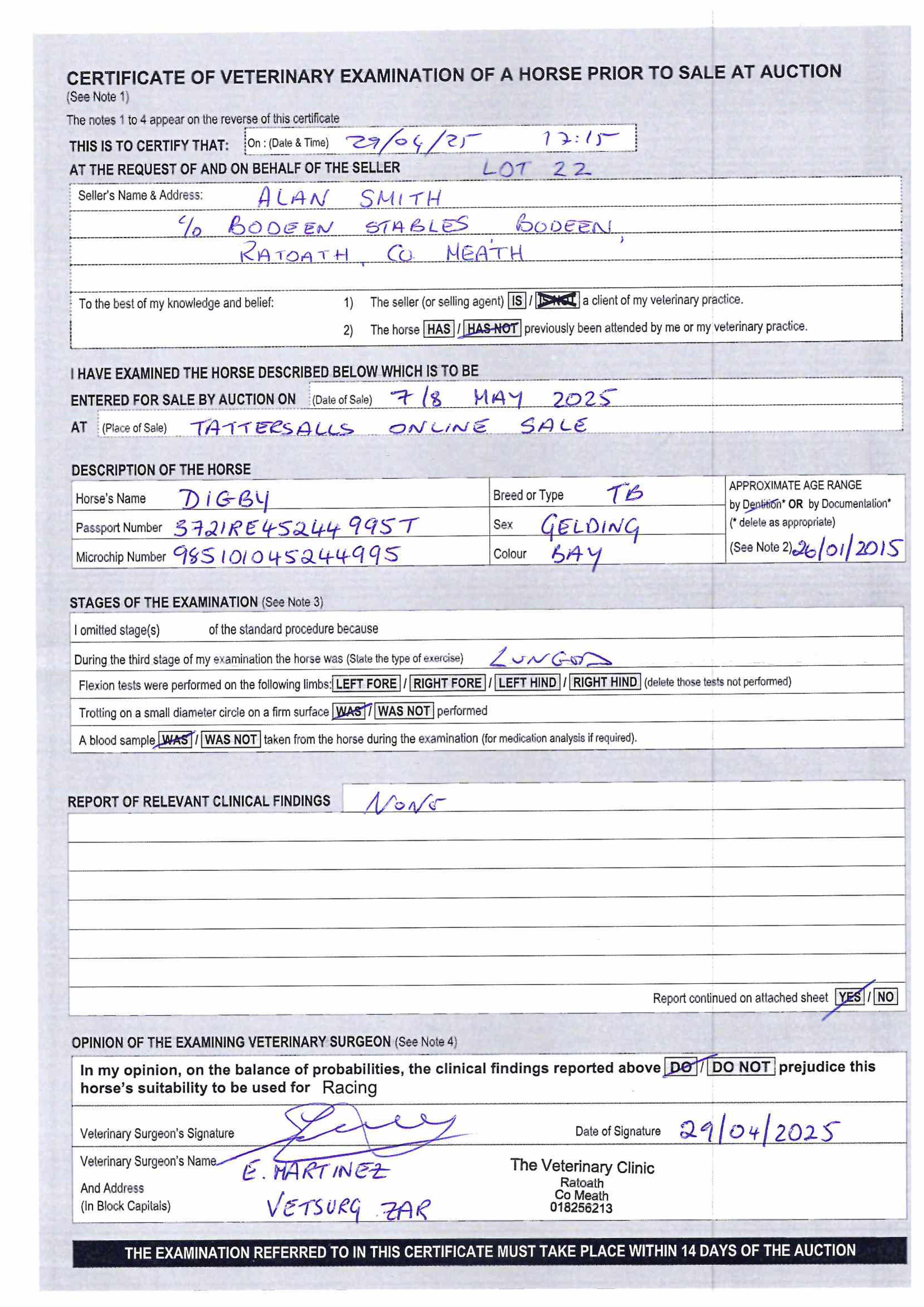 Vendor's Notes: Good looking, Sound in wind and limb Gelding, Four time winner, most recently on 24/04/25 @ Bangor, Novice over fences till November 25, stays 3m, fit and ready to race, goes on summer ground, will win more races, run up to sale date.