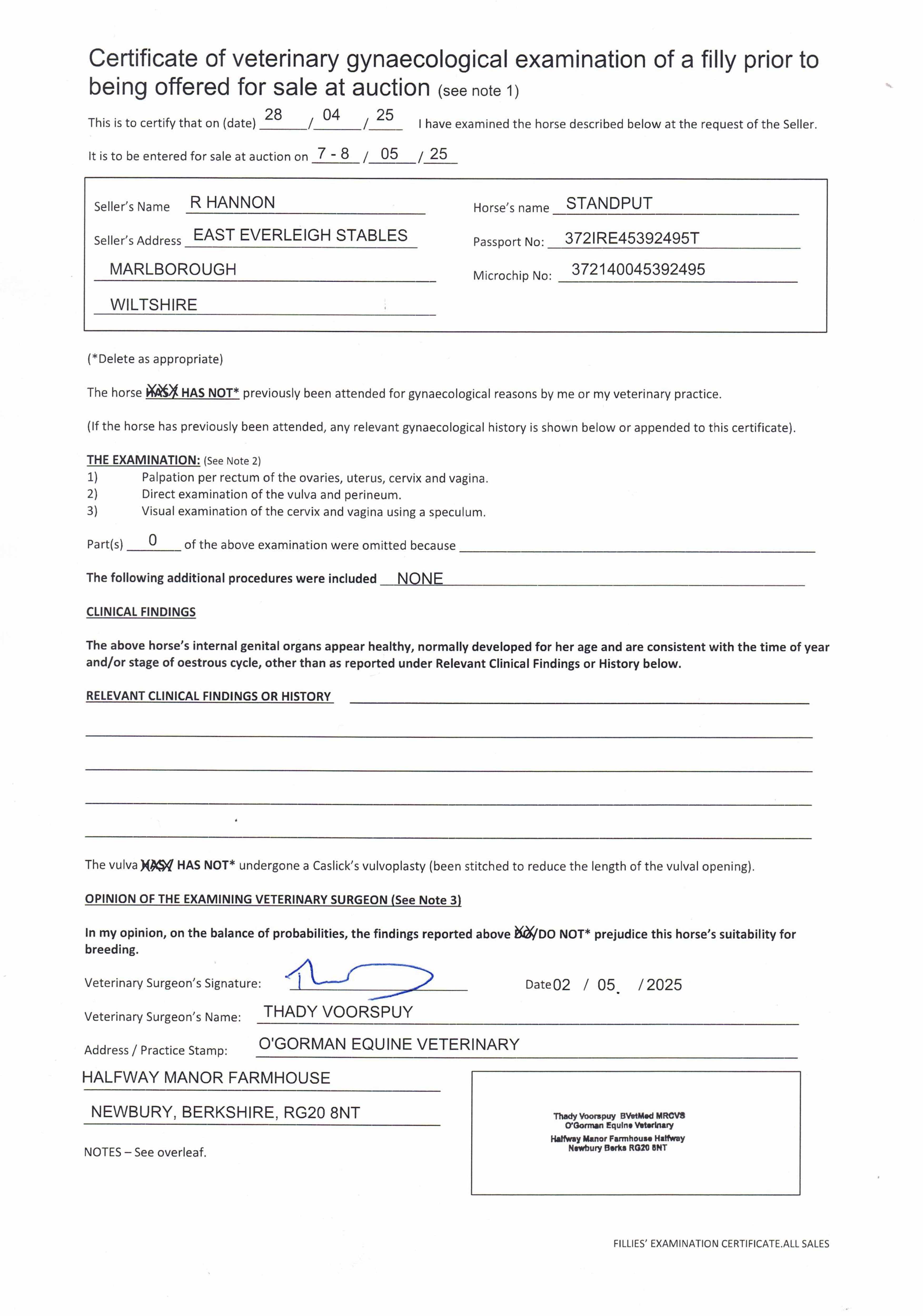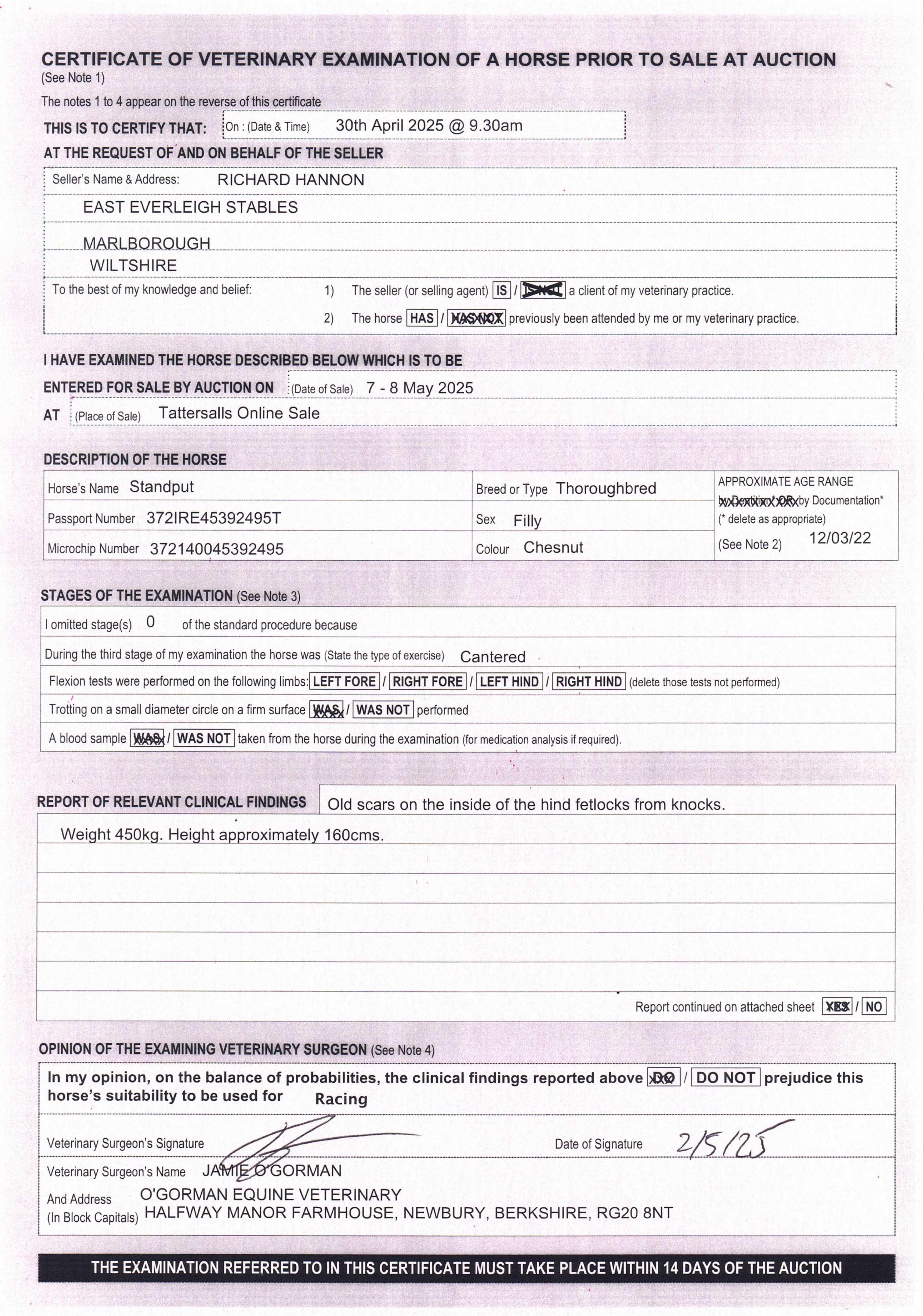 Vendor's Notes: Standput is a speedy filly with a nice attitude. Placed 3rd in a novice over 7f at Kempton, which was followed up by a win in a handicap at Wolverhampton. No vices.