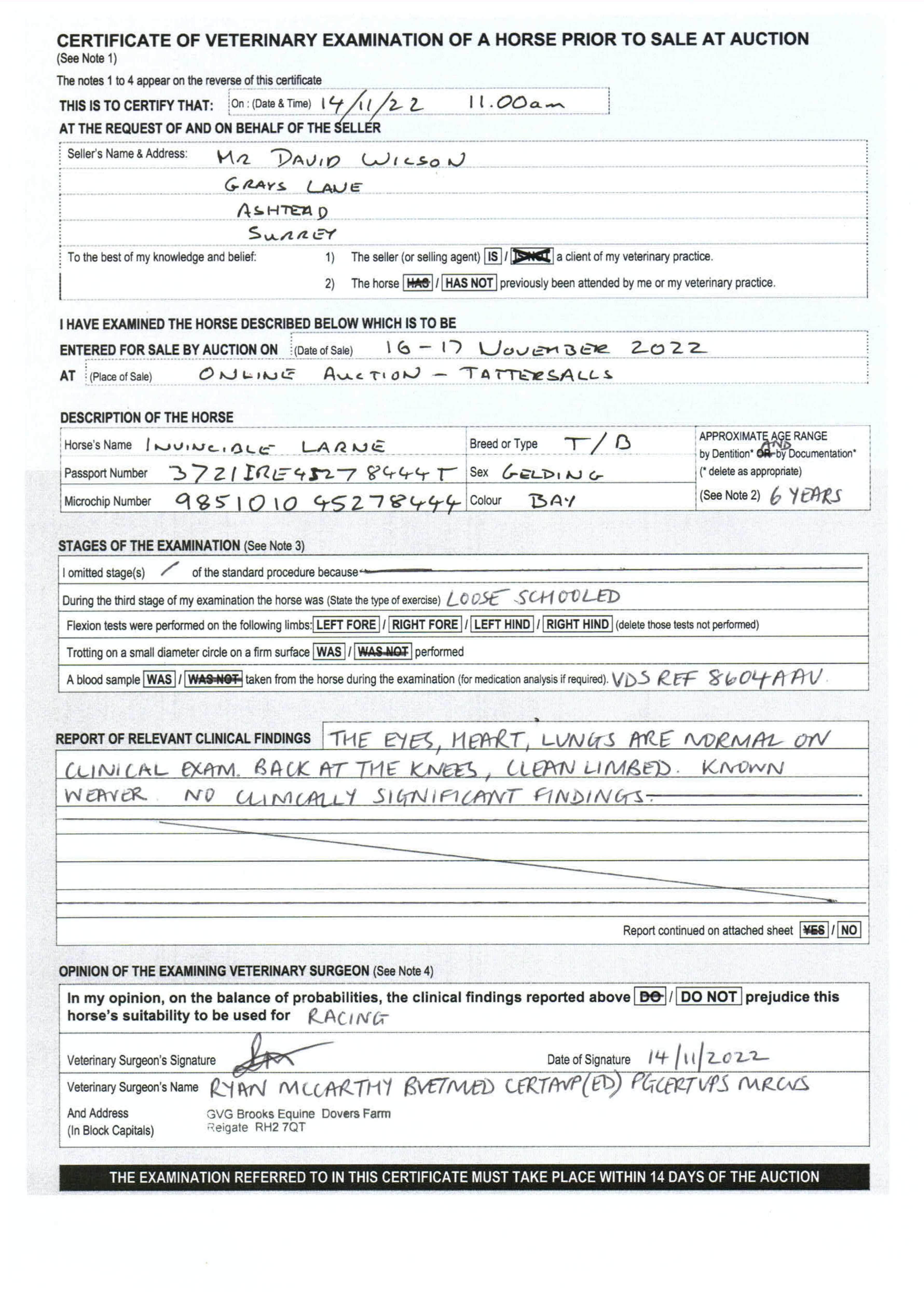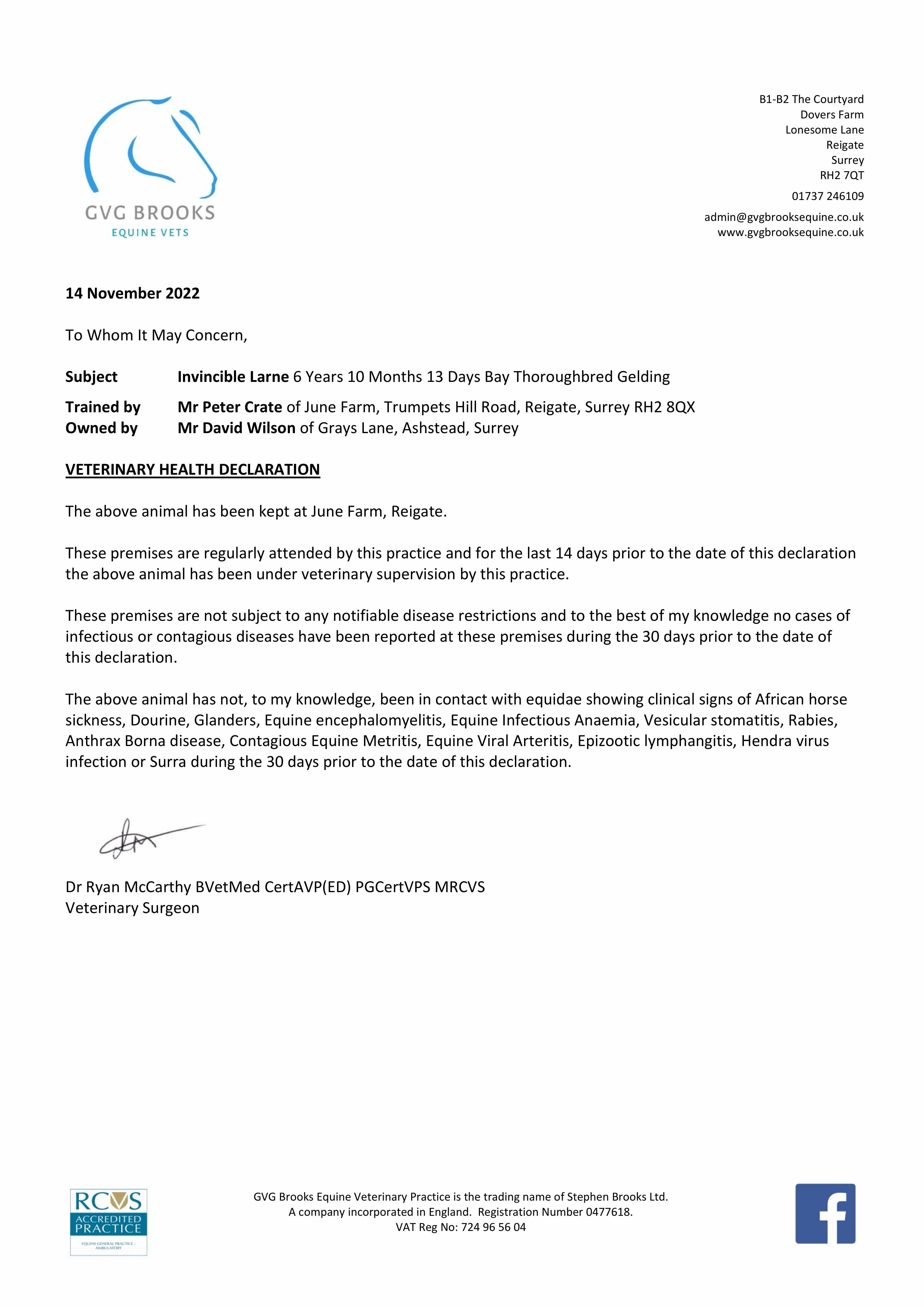 Vendor's Notes: Lot 62 - Invincible Larne
