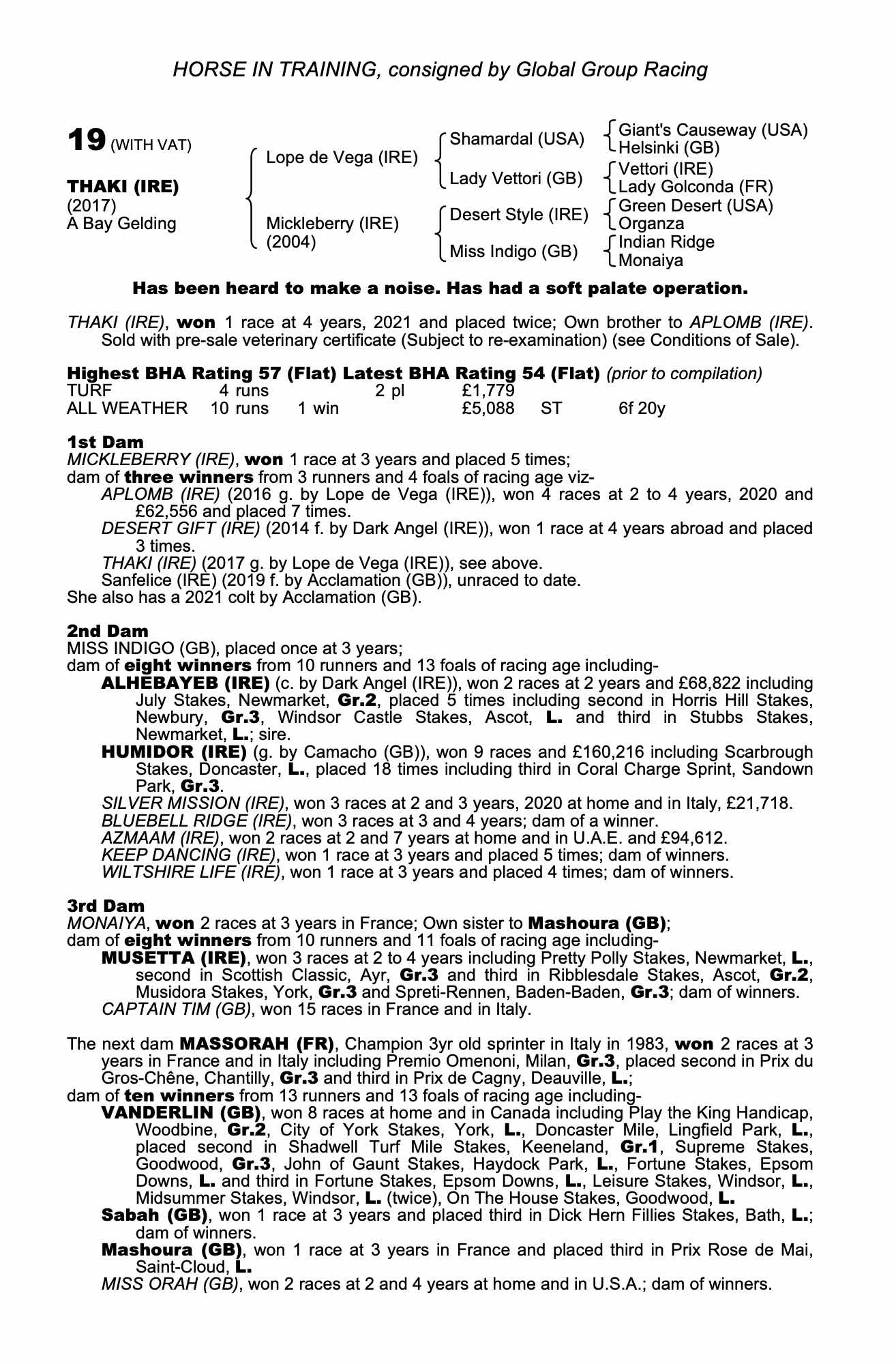 Vendor's Notes: Thaki will be prepared to run in the 6f handicap at Wolverhampton on 18th September and will be for sale with the entry made.