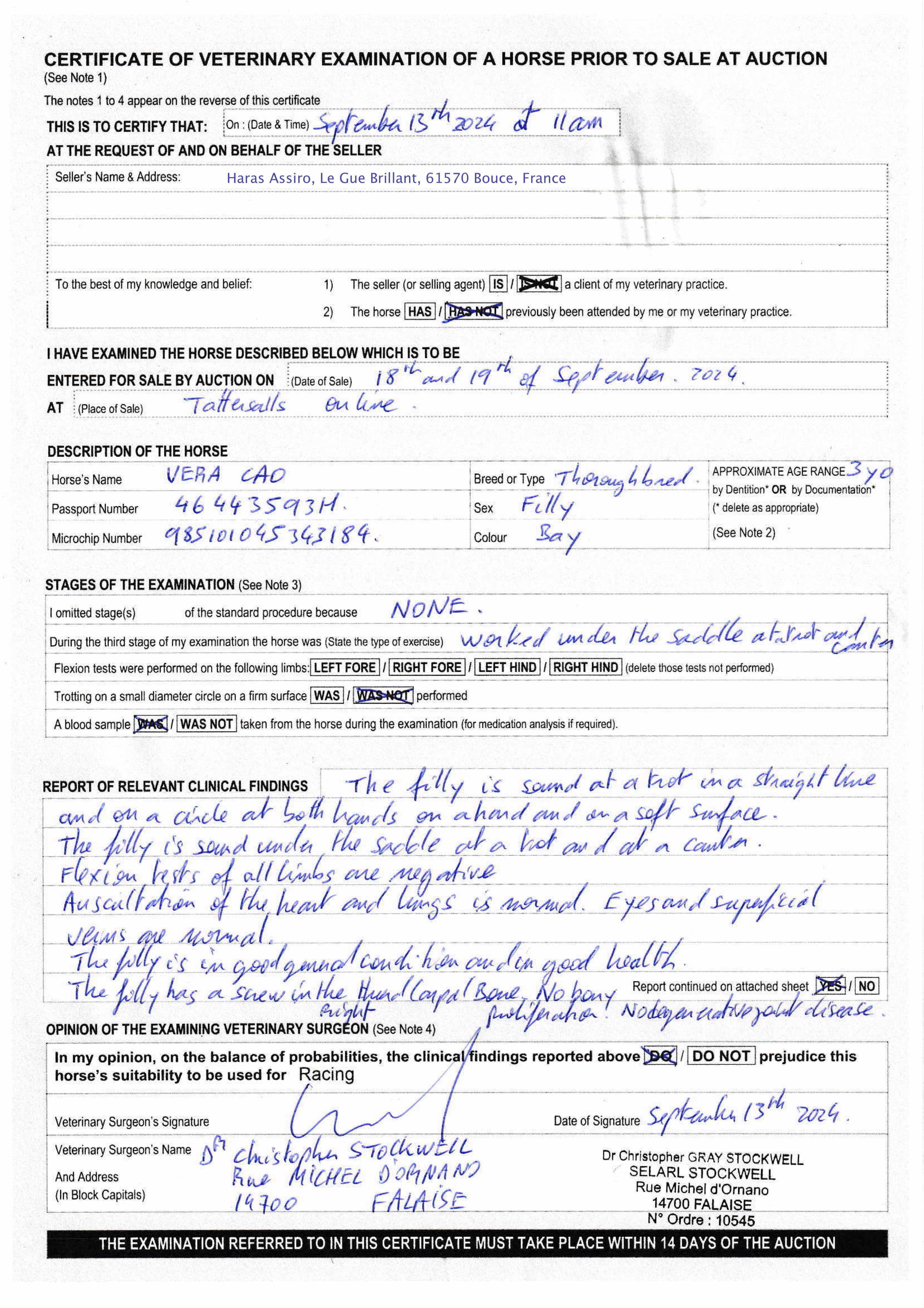 Now she is fully healed ( see X rays and vet repport) and the filly is back working normally. At the moment VERA CAO is doing steady canters and is ready to go back in full training.