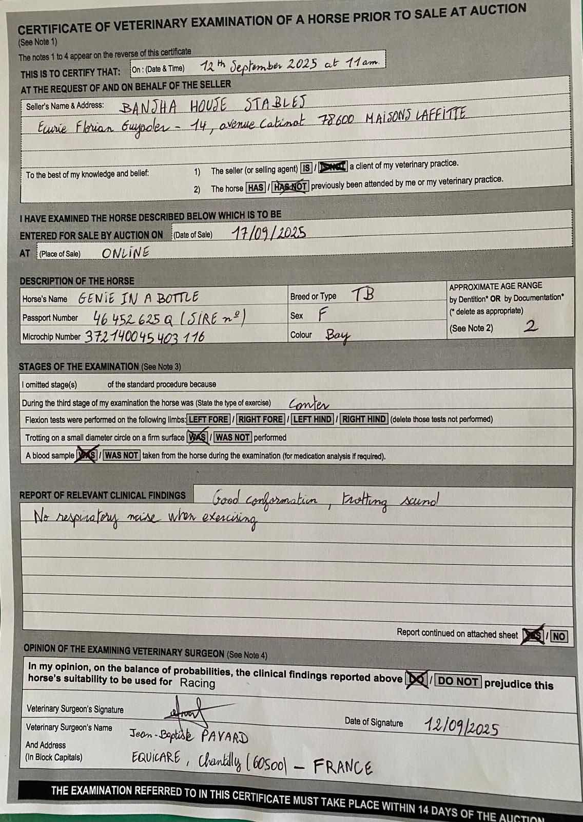 Vendor's Notes: Impressive Chantilly winner on her latest start breaking her maiden on the 5th of September over 1300m.