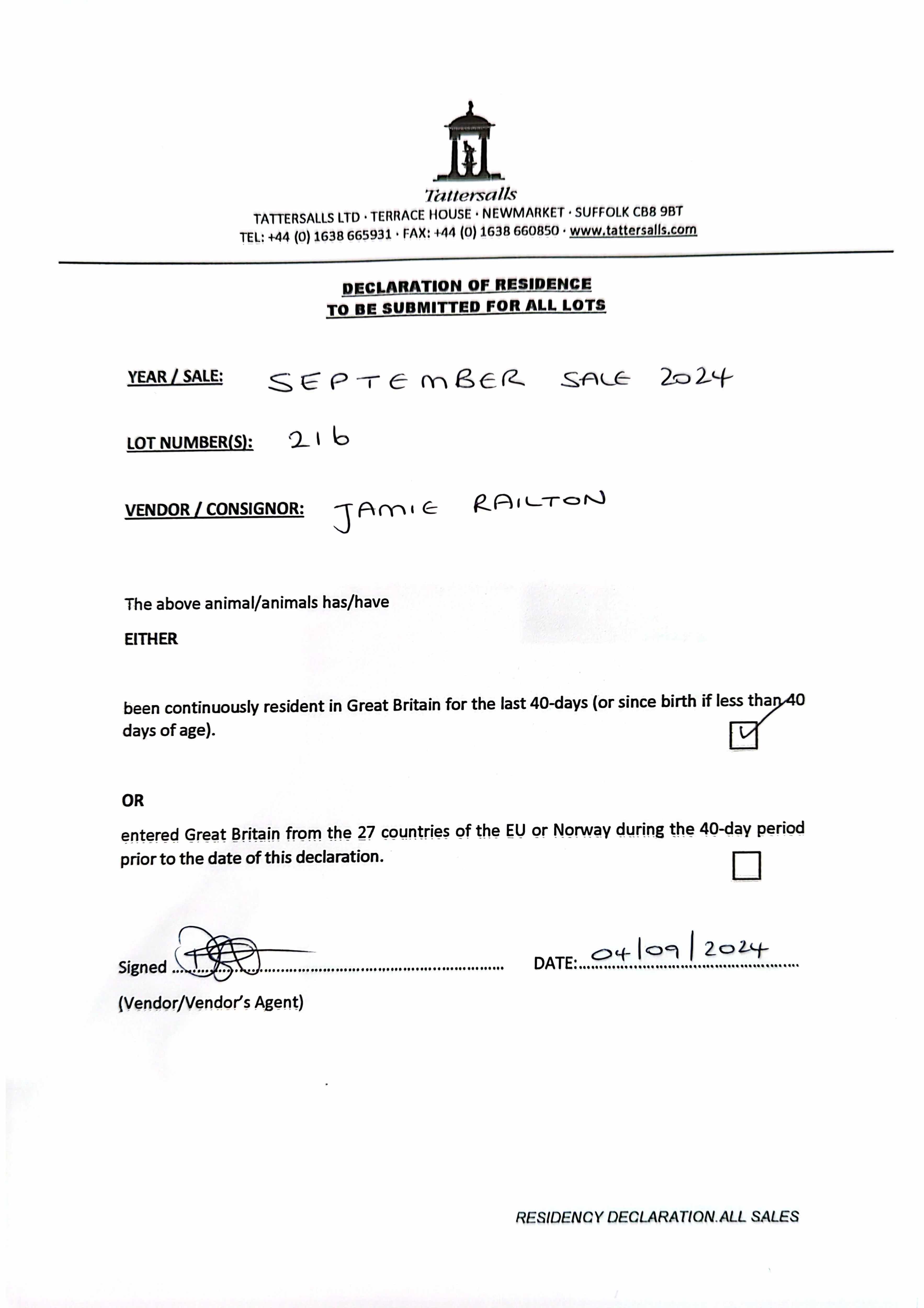 Consignor: Jamie Railton (Agent)