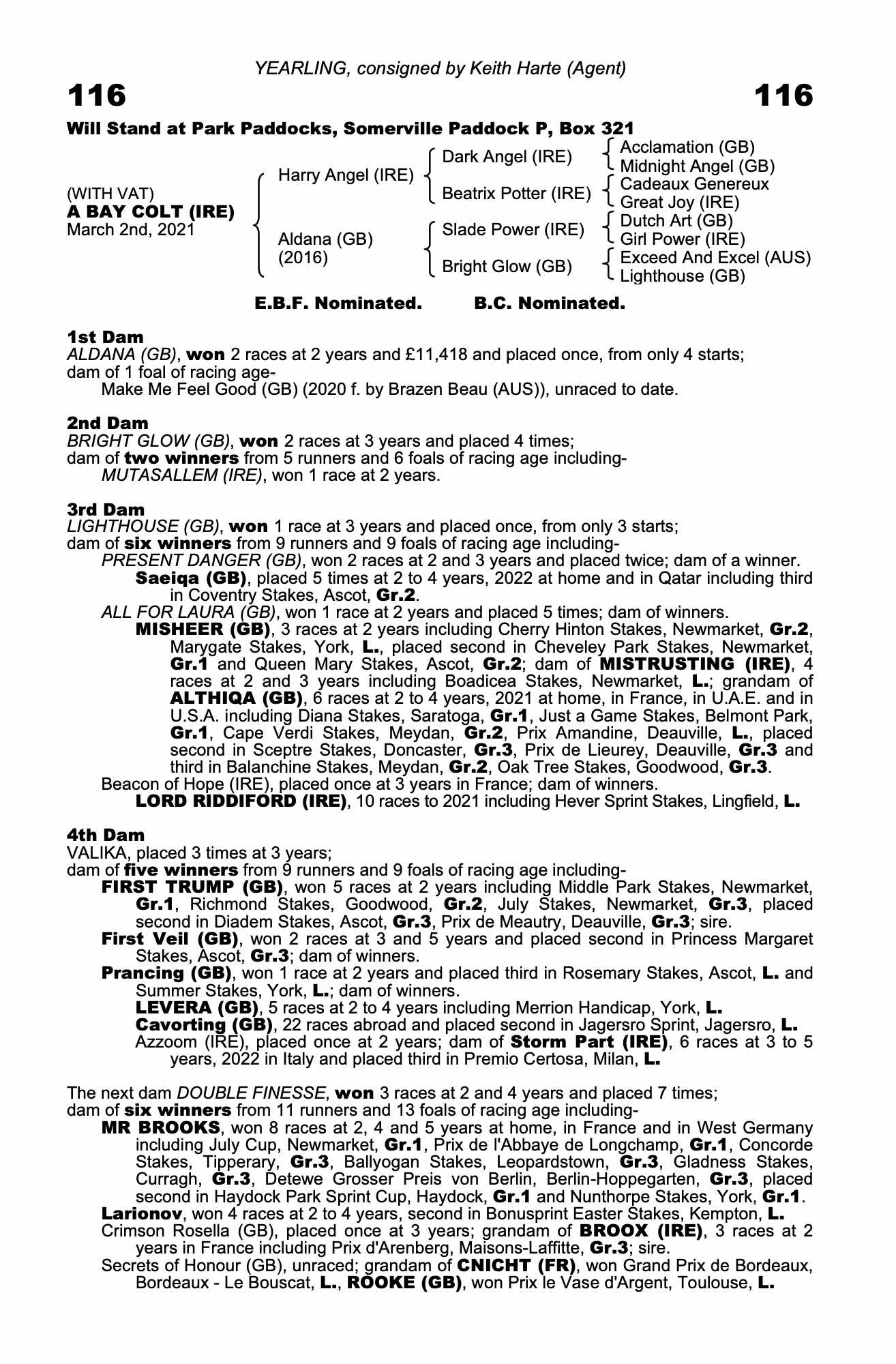 Under 3rd dam: MISHEER (GB), grandam of MYSTERIOUSNIGHT (IRE), won 2 races at 2 years, 2022 including Prix Francois Boutin, Deauville, Gr.3 and placed 3 times including third in July Stakes, Newmarket, Gr.2 and Vintage Stakes, Goodwood, Gr.2.