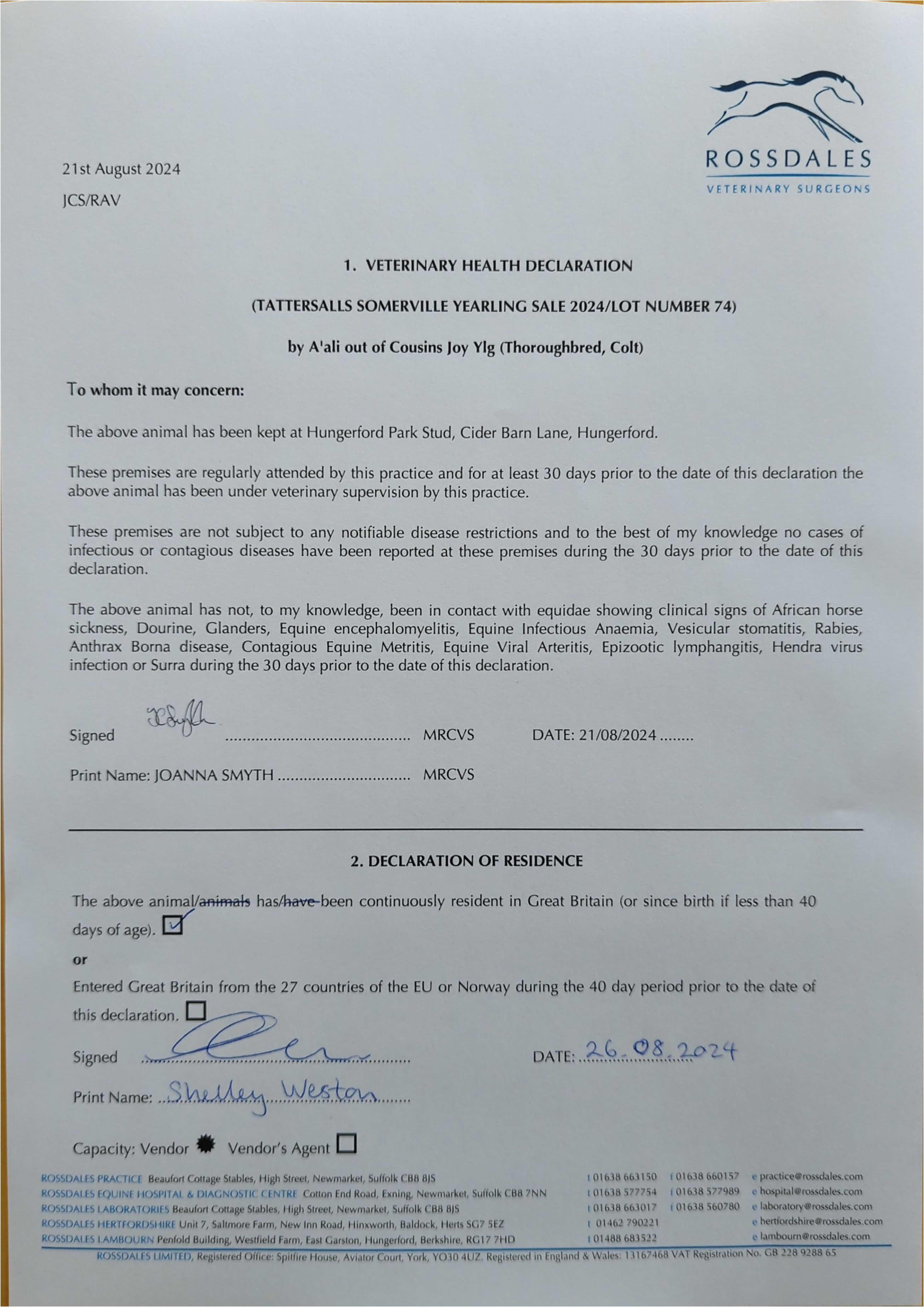 Official Veterinarian Declaration