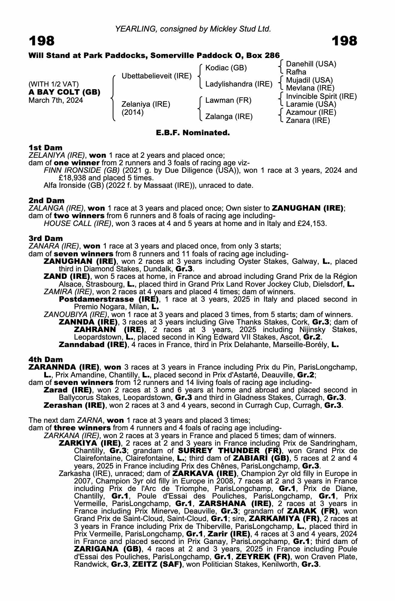 Under 3rd dam, ZANOUBIYA (IRE), dam of ZANNDA (IRE): ; dam of ZAHRANN (IRE), 3 races at 3 years, 2025 including Royal Whip Stakes, Curragh, Gr.3, placed twice, all his starts.